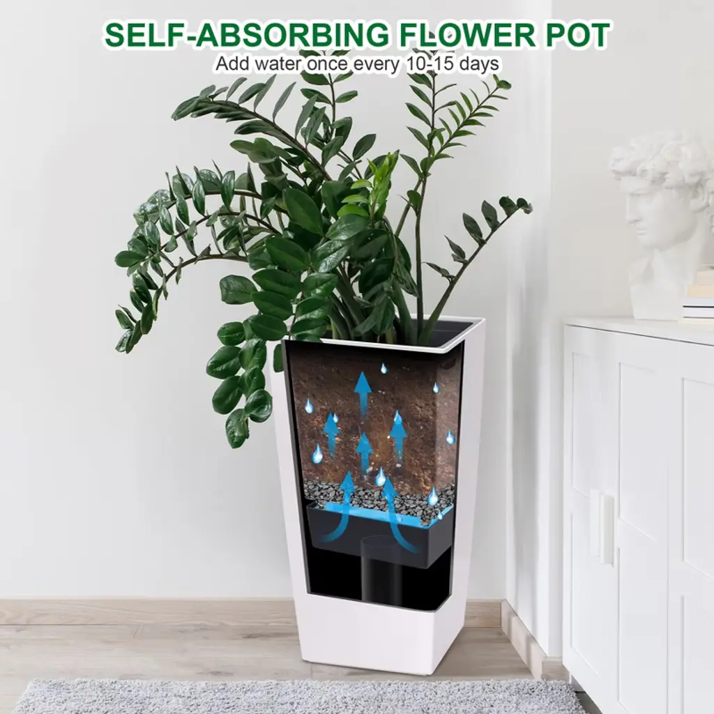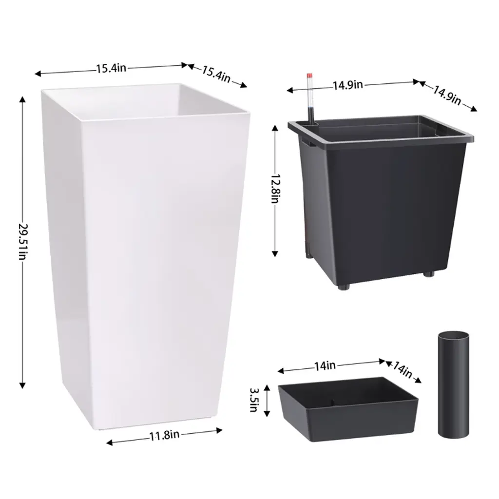 Water Level Monitor: Never Overwater Again – The built-in water level monitor alerts you when it’s time to refill, making the planter perfect for busy plant lovers who want to keep their greens thriving without the stressSmart Watering Self-Absorbing Technology – This tall planter ensures your indoor and outdoor plants receive just the right amount of water, so you can enjoy lush greenery without the constant worry of drying outEasy Movement with Wheels – Designed for convenience, the smooth wheels allow you to effortlessly move the modern planter, even on uneven surfaces, so you can easily rearrange your greenery to suit your moodSleek Modern and Heavy-duty Design – With a tapered shape that elevates any space, this outdoor planter is made from strong plastic materials, weather-resistant, and colorfast for long lastingEffortless Portability with Hidden Handle – The innovative hidden handle design of the planting baskets allows for easy movement, making plant pot simple to relocate your plants whenever inspiration strikes