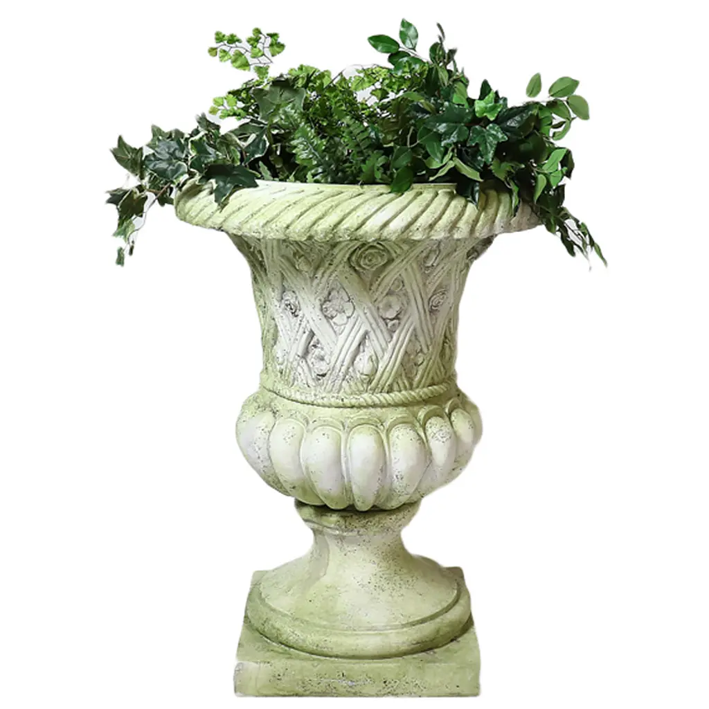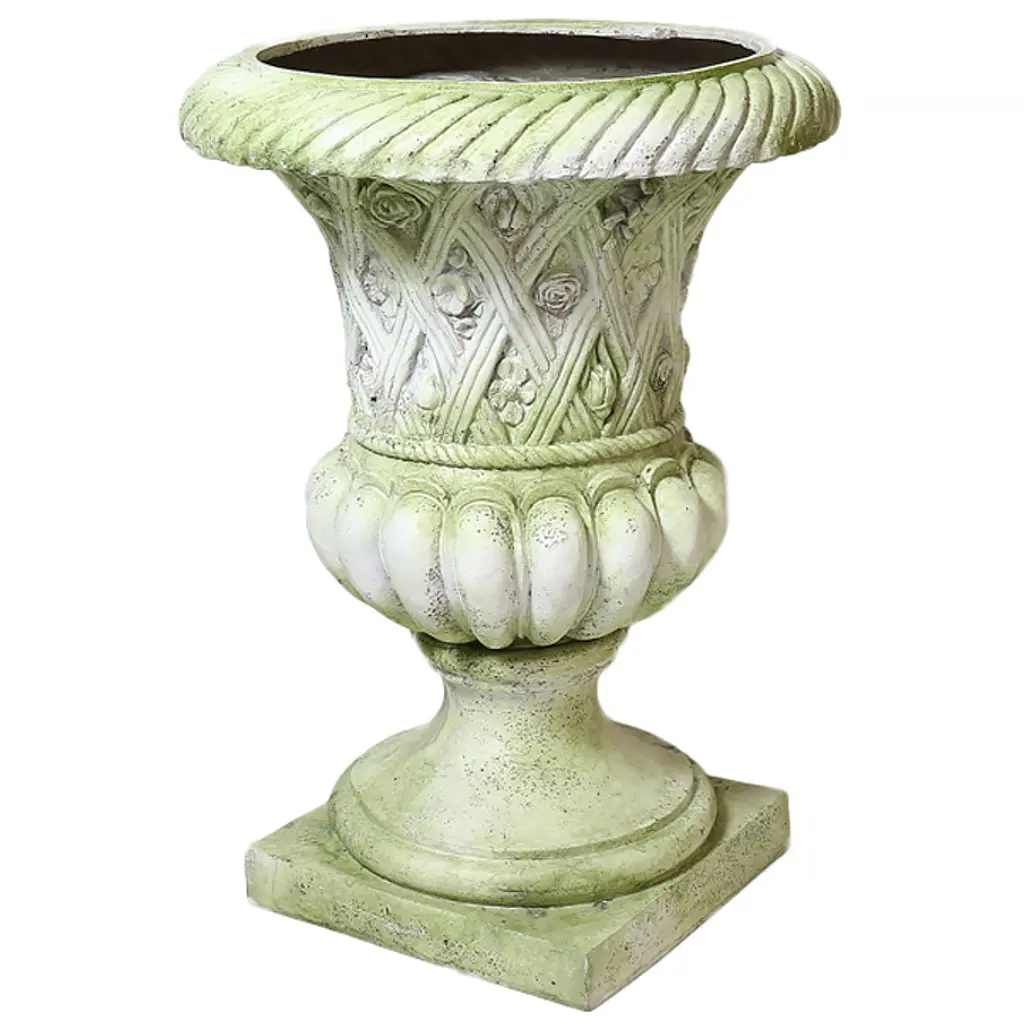 This richly detailed planter will bring Old World grandeur to your yard, walkway, or entry. It's handcrafted in the USA of Fiber Stone, which features a mix of sand and stones cast into the surface to provide the appearance of aged stone, and has been given a slightly mossy finish to heighten the illusion. Because the material is reinforced with fiberglass, it's both lighter in weight and more durable than concrete. The planter includes a bottom hole for drainage.