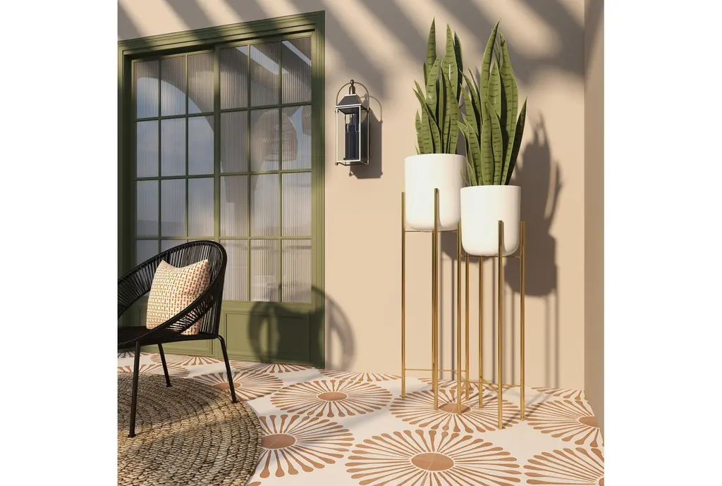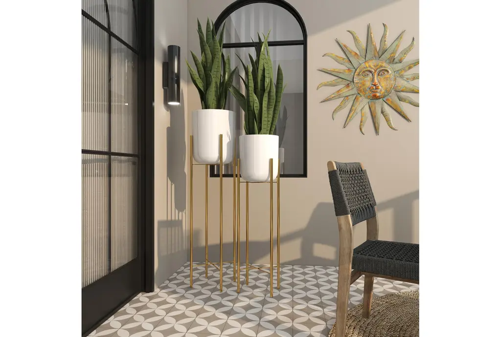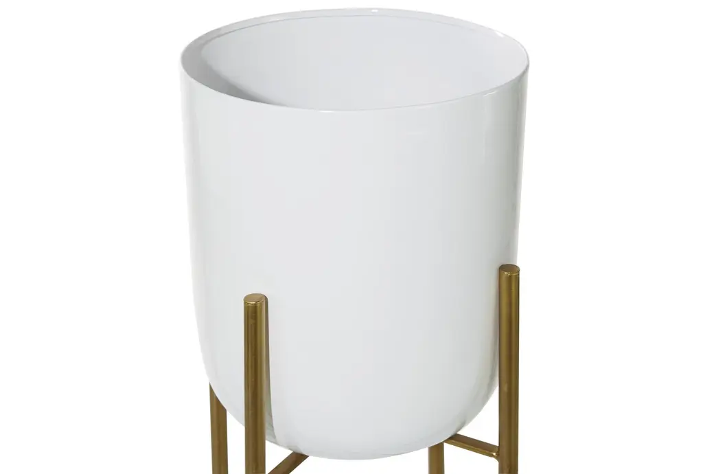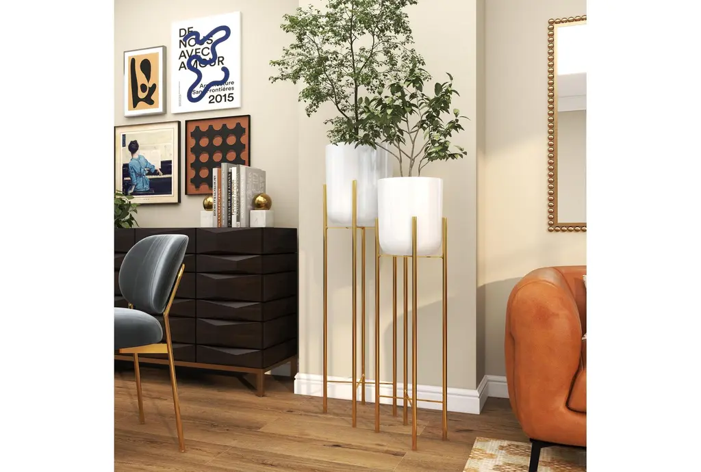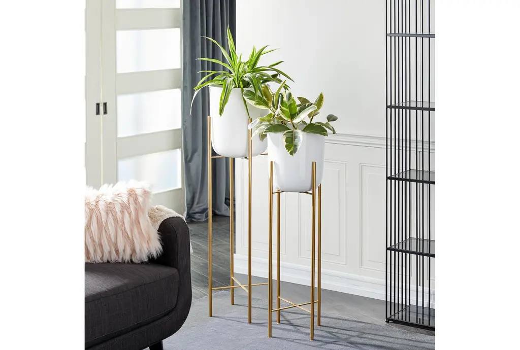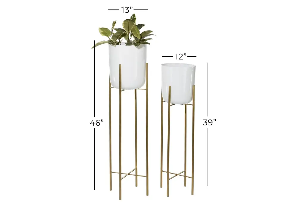 Enhance your living space with the 39" 46" White Metal Dome Indoor Outdoor Planter with Removable Stand Set of 2 by CosmoLiving Cosmopolitan. These planters offer a touch of modern sophistication with their sleek, polished white finish and gold-colored stands. Perfect for both indoor and outdoor use, they are crafted from durable, high-quality iron to ensure long-lasting beauty and functionality.