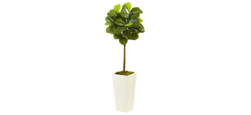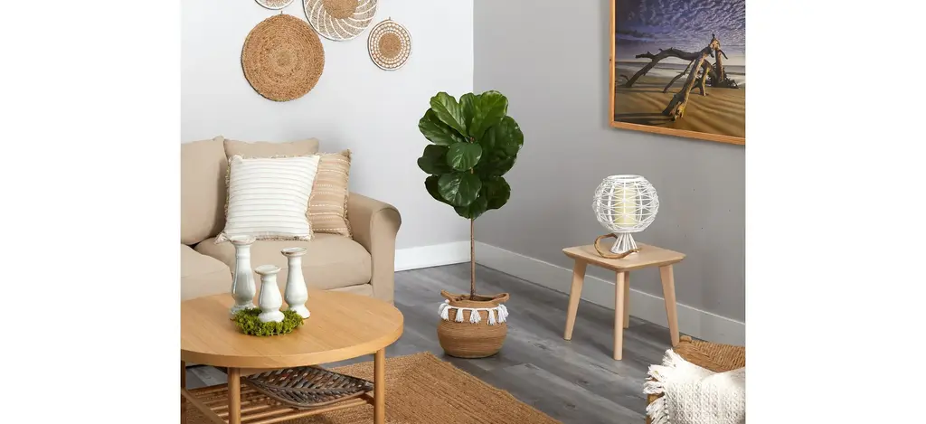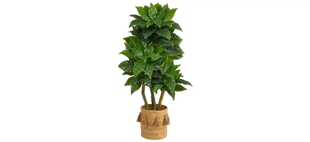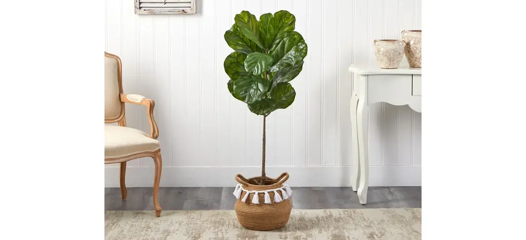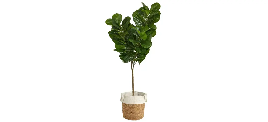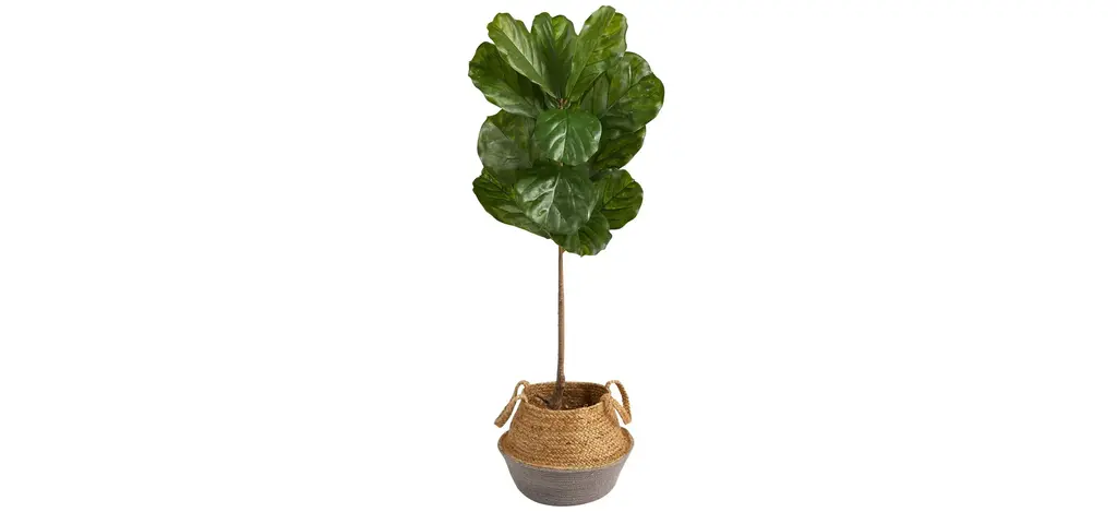 Make a fresh, natural statement with this 4' Indoor/Outdoor Fiddle Leaf Artificial Tree in Planter with Tassels. If you've tried growing one indoors, you know how difficult it is. Luckily, you can trick all your friends into thinking you can care for one with this tree. Inspired by nature, large glossy Fiddle leaves have naturally occurring details throughout. Assembled from high-quality materials, feel free to bend the branches to fit in your space. Standing 4' from a woven planter, house in any area. Perfect for a living room, bathroom, or awkward corner. Safe for outdoor use. Artificial trees are manufactured using synthetic materials, such as polyester material or plastic, and are well designed and constructed to be life-like in appearance. Your artificial tree will look beautiful for years to come; simply wipe clean with a soft dry cloth when needed.