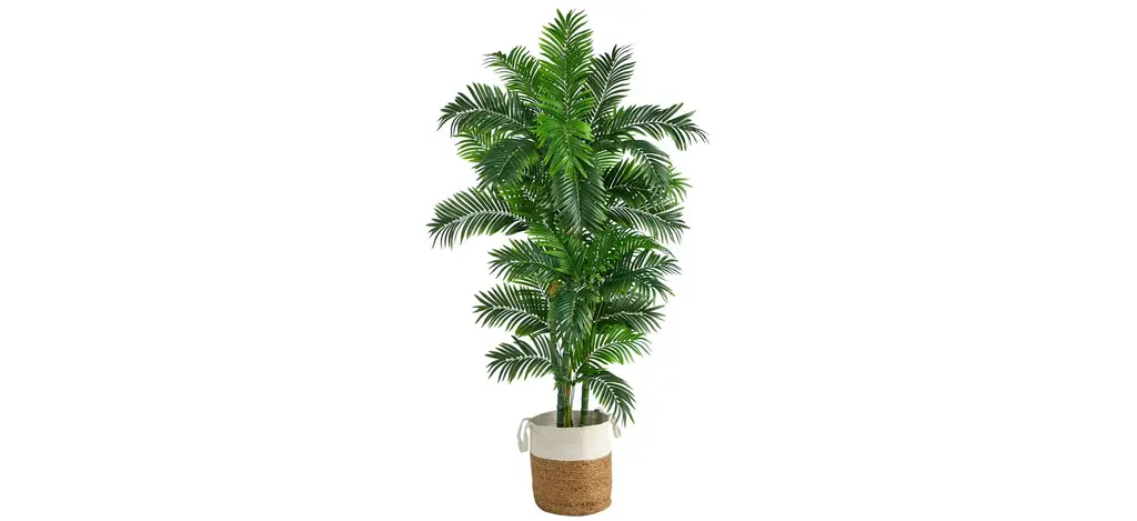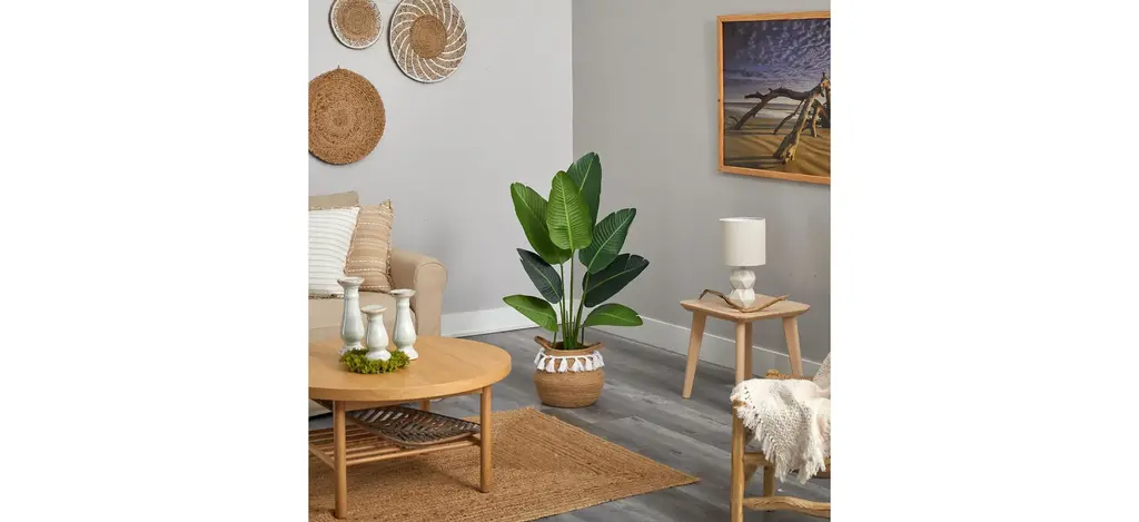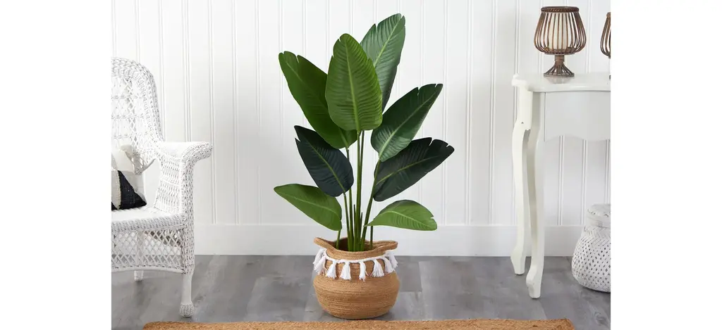 Modern yet chic, fill a bare corner in your space with this 4' Travelers Palm Artificial Tree in Planter with Tassels. Variegated large palm fronds have intricate detailing throughout that are inspired by nature. Assembled from high-quality materials, inject some color in low light areas or spaces in need of some life. Customize to fit in your room by bending the branches. Standing 4', house in any area. Add to a home office, living room or bedroom. Artificial trees are manufactured using synthetic materials, such as polyester material or plastic, and are well designed and constructed to be life-like in appearance. Your artificial tree will look beautiful for years to come; simply wipe clean with a soft dry cloth when needed.