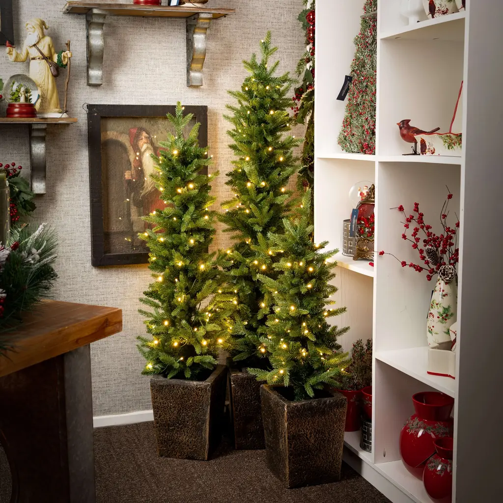 This stunningly simple exclusive artificial pine tree in planter from Sullivans will elevate any living space for the holiday season and beyond. Mid-size in heightl, the neutral faux fir branches and matte pot allow this warm white lit tree to seamlessly transition from festive accent to wintry decor piece all season long -just plug it in and let it shine! Perfect for those who want the classic look of a real pine tree without the fuss. • Stylish LED Pine Tree: Enhance your holiday ambiance with the Medium LED Pine Tree Planter, featuring a 49-inch tall artificial tree in a classic green color, perfect for indoor Christmas decor. • Integrated LED Lights: This tree comes equipped with built-in LED lights, providing a warm and inviting glow that enhances its festive appeal. • Quality Construction: Crafted from high-quality plastic, this artificial Christmas tree is durable and lifelike, offering a realistic appearance that lasts for seasons to come. • Versatile Decor Piece: Ideal for smaller spaces, this medium-sized tree is great for tabletops, corners, or entryways, adding a touch of Christmas charm to any room. • Easy to Display: Complete with a planter base, this LED pine tree is ready to be displayed right out of the box, making it a convenient and stylish addition to your Christmas home decor. • Experience Timeless Elegance with Sullivan's Home Decor - Celebrating Over 55 Years of Excellence! Explore our extensive collection of quality products, meticulously curated to suit every style, season, and occasion. From classic designs to on-trend accents, Sullivan's Home Decor seamlessly blends tradition with modernity, ensuring there's something special for everyone. Transform your living spaces with our enduring commitment to style and sophistication. • Tree measures 15"L x 15"W x 4'1"H