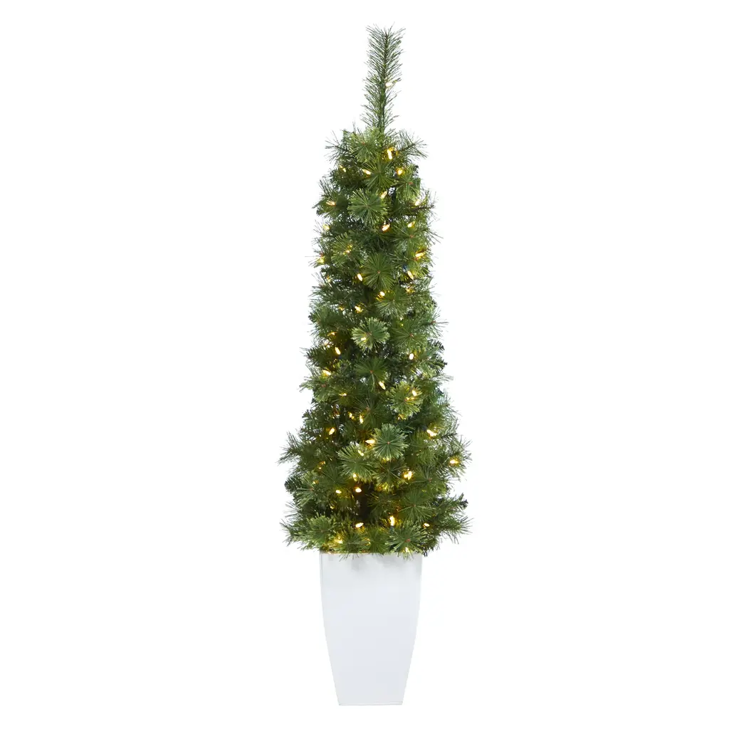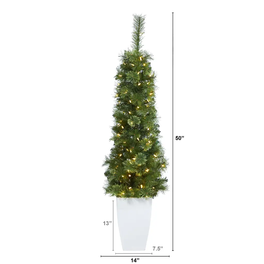 Tight areas deserve some Christmas cheer too. Decorate slim and small spaces such as foyers, corners and apartments with this Green Pencil Artificial Christmas Tree. Designed by our interior decorators using the highest-quality materials - this incredibly lifelike tree mimics the spectacular foliage and texture of real trees - elegantly decorate with your favorite mini-ornaments. Arriving pre-strung with 100 clear (multifunction) LED lights, it features 8 different light options (twinkle, bursts and fade) to create that holiday glow. Standing at 50" from a white metal planter (included in height), spruce up even the tightest spaces.