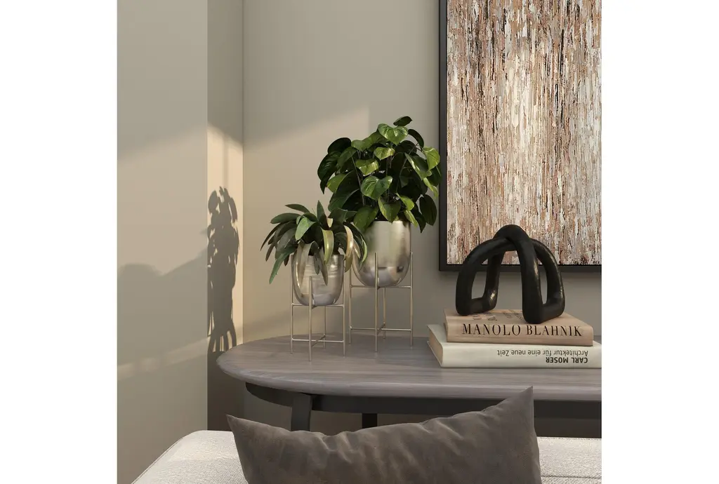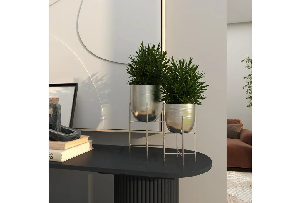 Enhance your living space with the sleek elegance of the 6" 5" Silver Metal Indoor Outdoor Planter with Removable Stand Set of 2. These planters are designed to offer effortless luxury with their minimalistic design and clean lines. Perfect for both indoor and outdoor use, they bring a touch of modern sophistication to any environment.