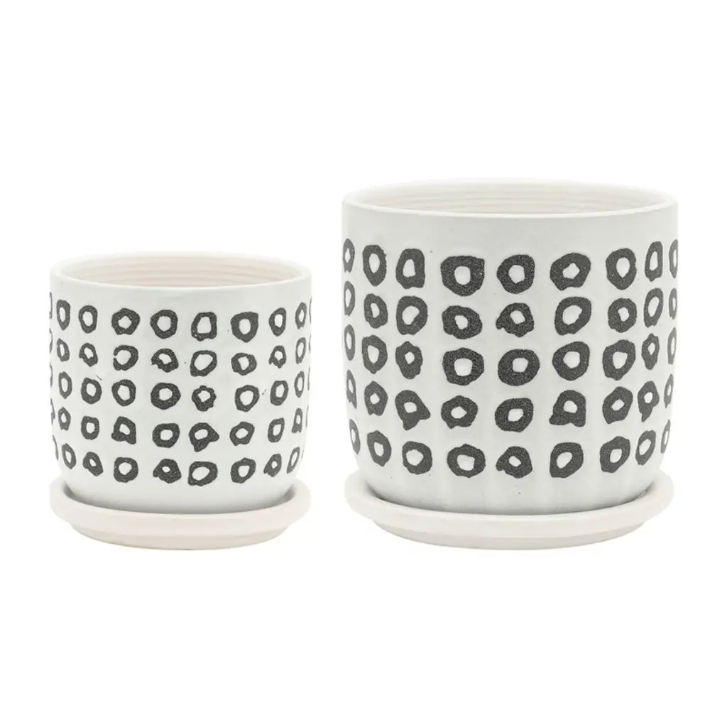 A beautiful and functional piece, this black and white geometric stoneware planter enhances any plant collection. The planter is crafted from premium stoneware that has a smooth and glossy finish. The planter has a round shape and four feet that elevate it from the ground. The planter has a black and white geometric pattern that is printed on the surface of the planter and creates a stunning contrast. The pattern consists of triangles, squares, circles, and lines that form a dynamic and harmonious design. The planter does not have a drainage hole, so a liner or a saucer is recommended to prevent water damage to plants and surfaces. The planter can accommodate a 7-inch pot and is perfect for medium-sized plants such as ferns, orchids, or snake plants. The planter can be placed on tables, shelves, countertops, or floors and can complement any minimalist, contemporary, or Scandinavian-style home décor. Whether used indoors or outdoors, this black and white geometric stoneware planter adds some personality and elegance to any space.