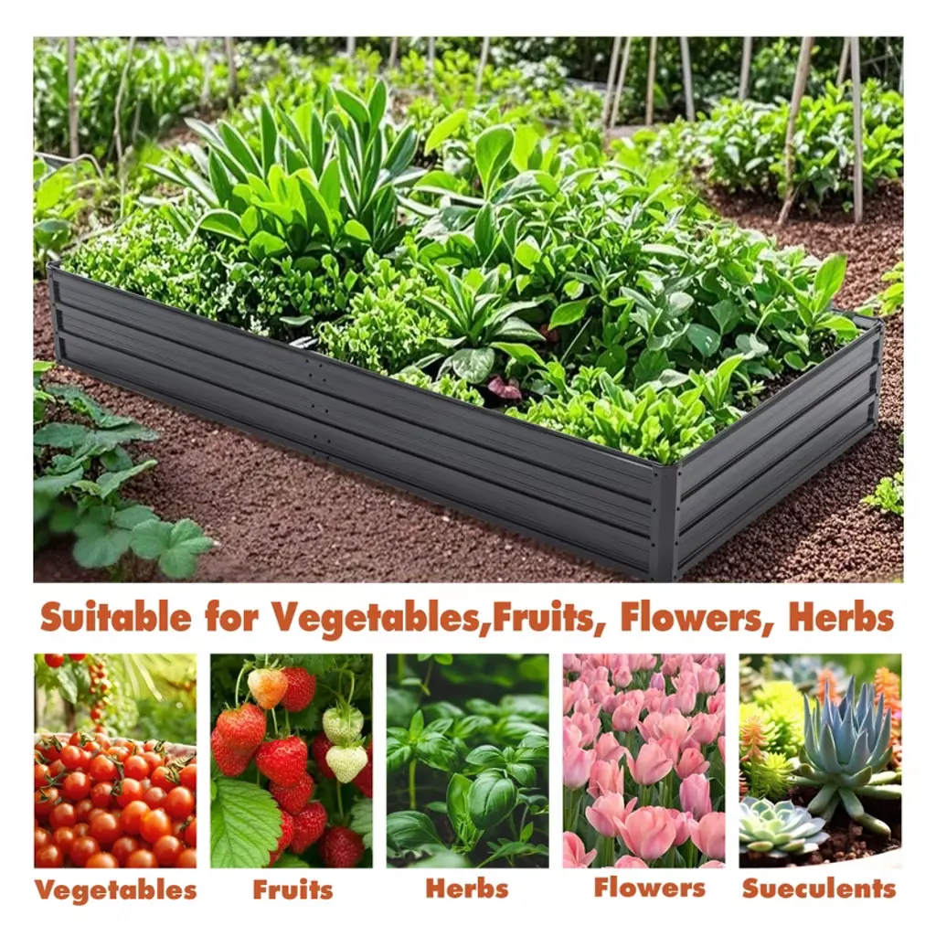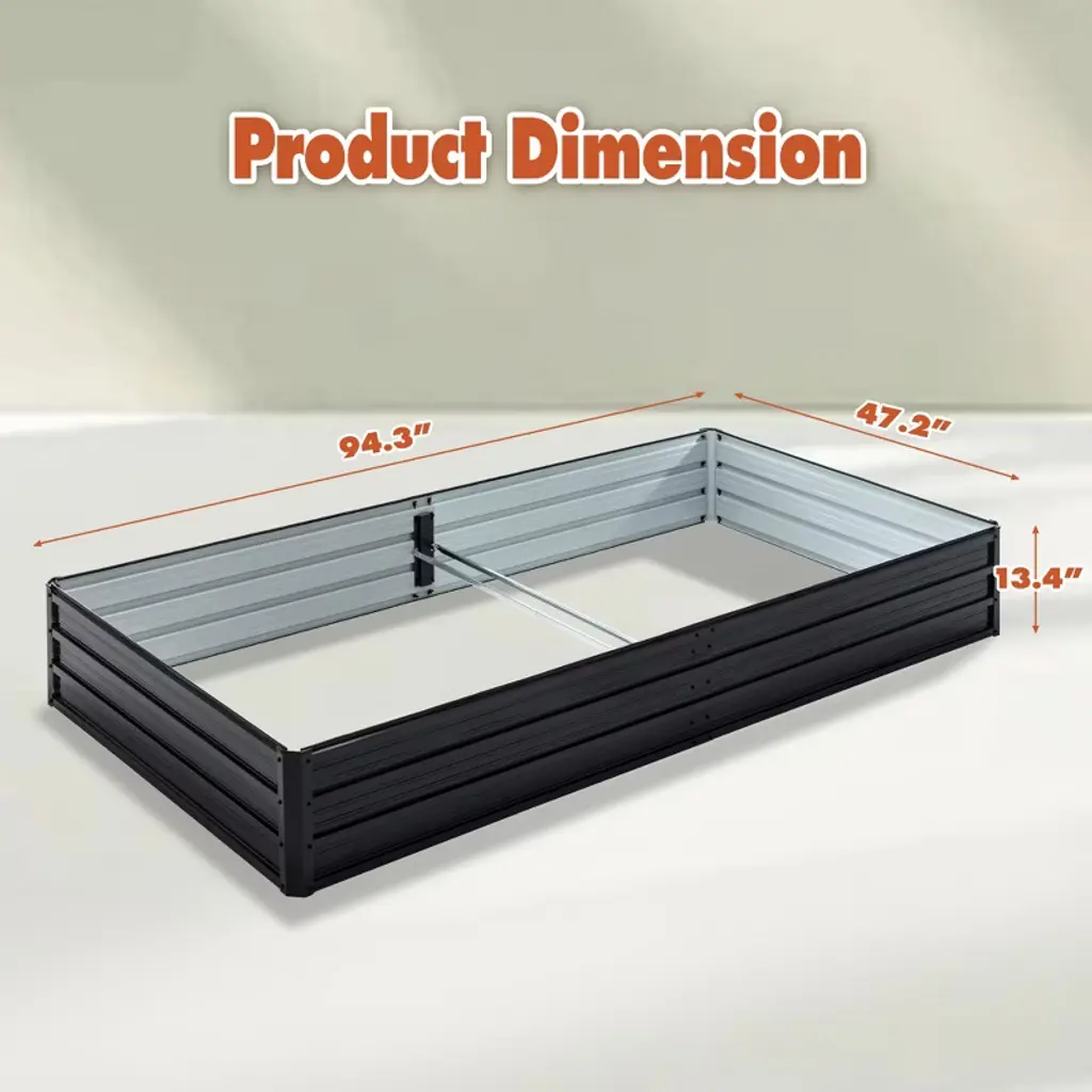 Elevate your gardening game with this 8×4×1ft galvanized metal raised garden bed—designed to give plants the space and support they need to thrive. With an overall size of 94.3" × 47.2" × 13.4", this planter box offers abundant room for growing a variety of vegetables, herbs, flowers, and fruits in a neat and organized space. Crafted from thickened galvanized metal, this raised bed is built to withstand all kinds of weather—rain, snow, or sun. Its open-base structure ensures proper drainage and promotes healthier root systems by allowing excess water to escape naturally. Easy to assemble with included tools and step-by-step instructions, it’s perfect for gardeners of any level. Whether you're building a backyard vegetable garden or a vibrant flower bed on your patio, this versatile planter delivers both function and beauty.