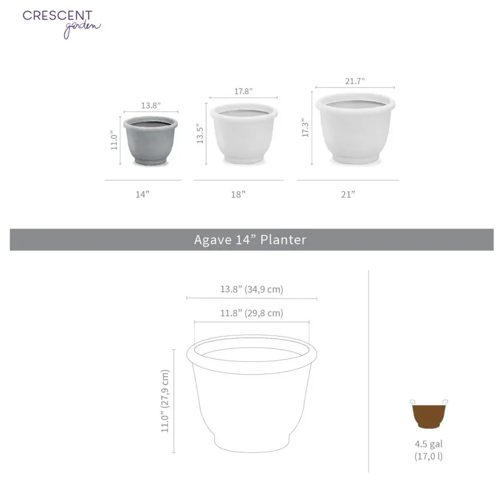 Complete your outdoor space with the Agave Planter from Crescent Garden. With a weathered stone finish, this round planter looks good just about anywhere - your patio, deck or front stairs. Fill with your favorite flowers or greenery to enjoy as the seasons pass. This lightweight, weather-resistant planter, that is constructured with 100% recyclablle plastic, comes with a 10 year warranty from cracking or fading. - LIGHTWEIGHT & DURABLE: Constructed with 100% recyclable plastic, making it lightweight, chip-resistant and durable. - WEATHER-RESISTANT: The sturdy planter structure ensures the planter won''t fade or crack during extreme temperatures, perfect for winter and summer gardening. - DRAINAGE HOLE: Features a pre-drilled drainage hole. - FOOD-SAFE: Perfect for edible gardening and growing your favorite herbs. - 10-Year Limited Warranty- DIMENSIONS: Inside dimension: 11.8"W x 11"H / Base: 7.8" / Soil capacity: 4.5 gal