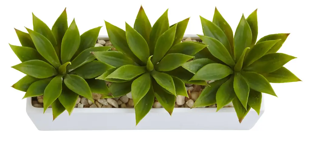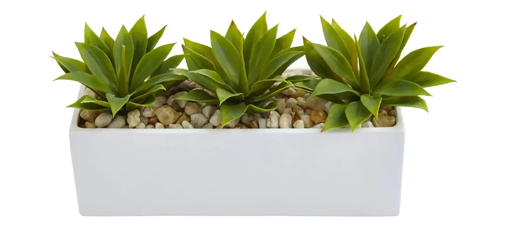 Agave Succulents in bright green pop against tan river rocks. Bright green Agave pops against a crisp, white modern planter for a contemporary look. Perfect for small dining spaces or the bathroom. Bring maintenance-free greenery indoors to last all year long.