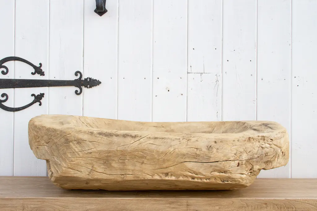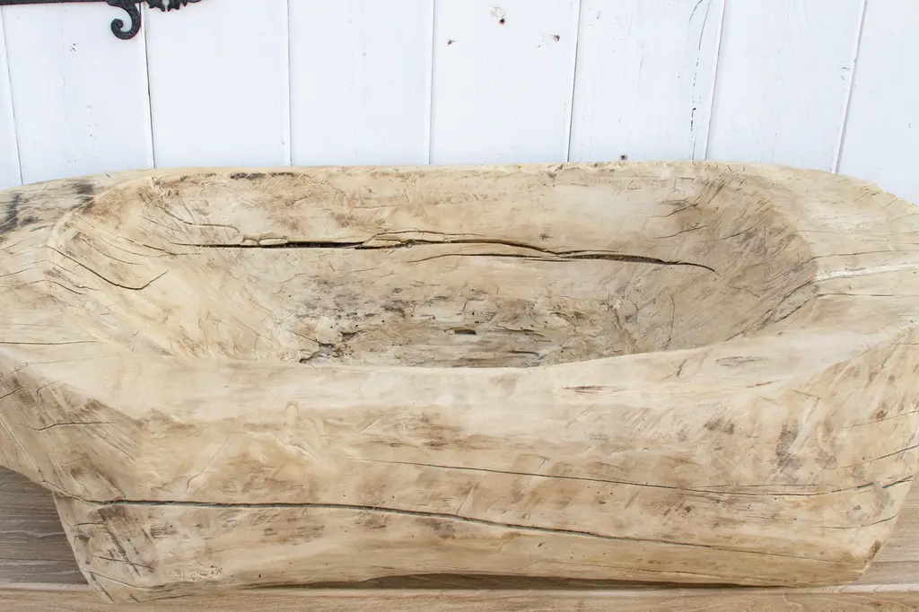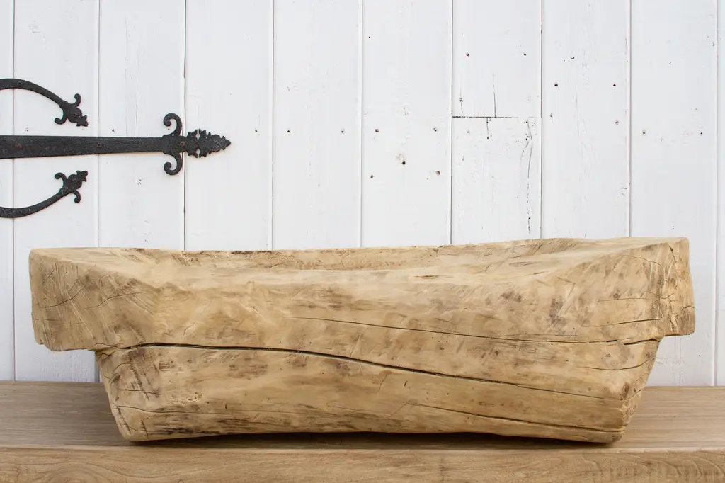 A beautiful semi-oxidized wood trough carved from a single tree trunk. Originally used to feed farm animals this massive antique through will be a lovely planter. This indoor/outdoor planter shows age with a sanded and bleached finish.