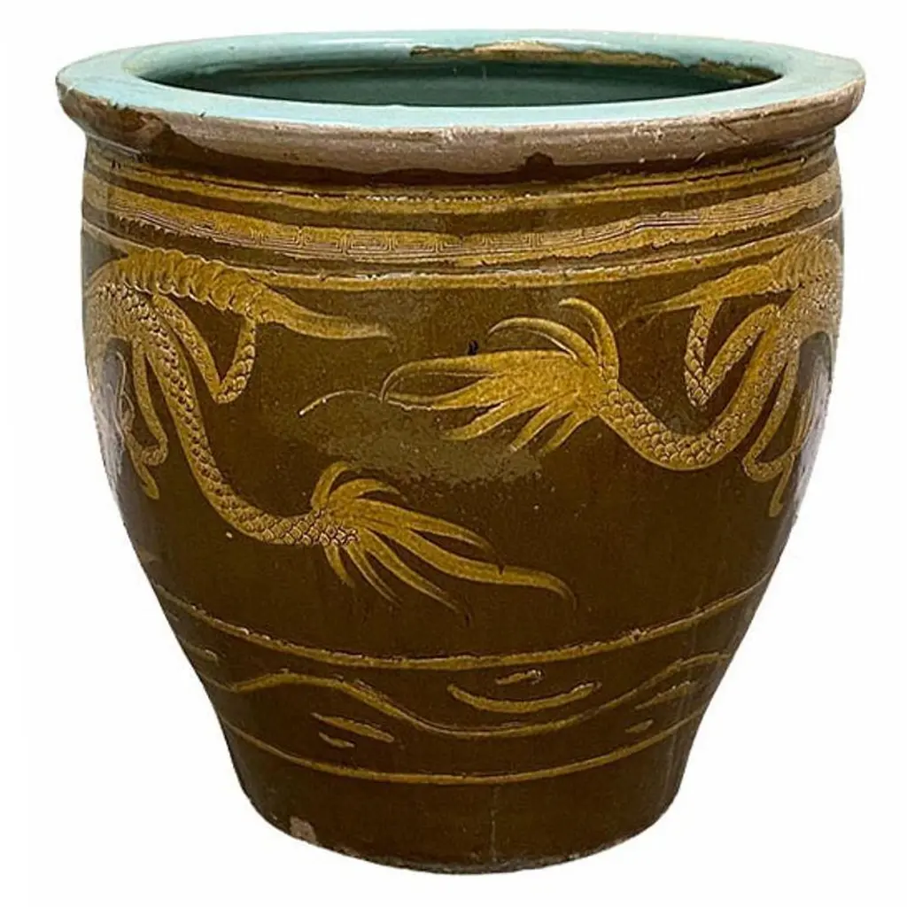 Late 19th Century Century egg Chinese art pottery pot featuring an Asian dragon along the front. These Pots are over 120 years old and were used to store black "Century eggs" and now make great planters for the garden, as jardinières, cachepots, or fishbowl.Century eggs, also known as preserved eggs, are a Chinese delicacy made by preserving duck, chicken, or quail eggs in a mixture of clay, ash, salt, quicklime, and rice husks for several weeks to months. They have a unique taste and texture, with a creamy, custard-like yolk and a translucent, jelly-like egg white.In the style of Tony Duquette.Sale for 1 Vase, 2 vases availableDimensions: Height: 19 in Width: 20 in DiameterChina, 1890