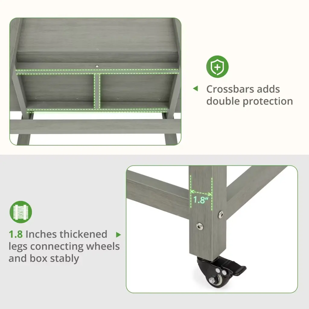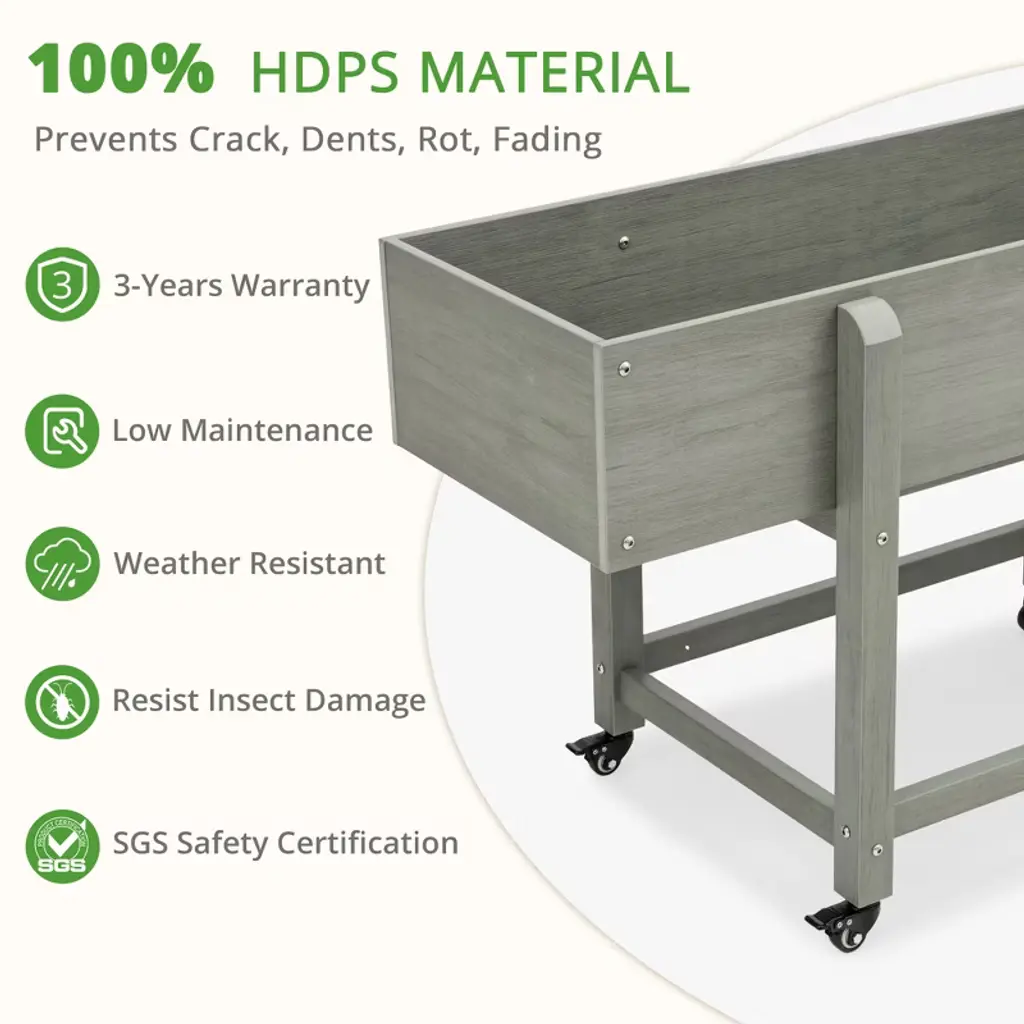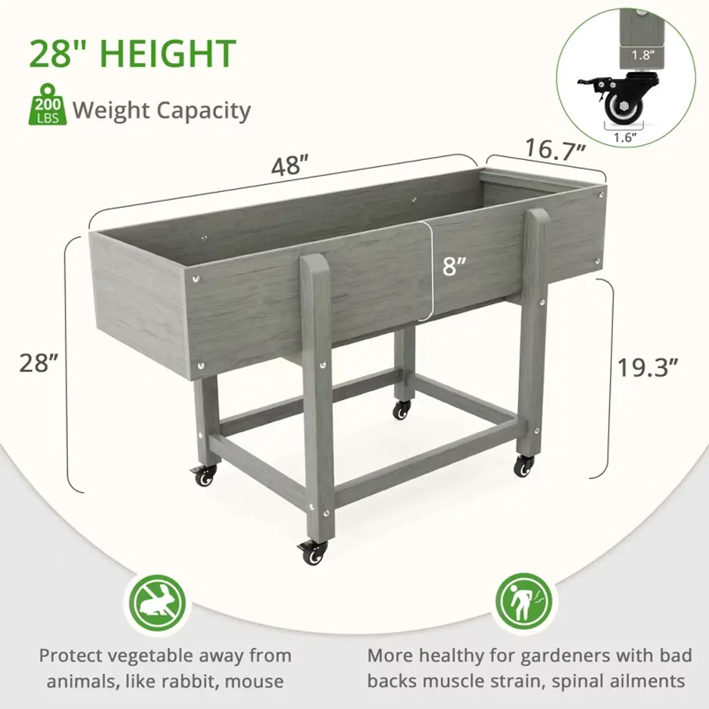 [Durability & Safe HDPS Material]: The garden box won't crack, fade, peel and rot in any weather condition. It is made of HDPS material,which passed the SGS safety certification of US. You don't need to brush oil for maintenance, just clean it with garden hose to keep it clean [Flexible movement]: Even if Being filled with heavy soil will not affect its flexibility. You can move the flower bed around the deck depending on the sun and wind. [Additional Free Tools]: shovel(2pcs), non-woven fabric(1pcs), hook(3pcs), rake(1pcs). Just fill with soil, seeds or plants and place in a sunny location [Large Capacity] The Large size planter box: 48¡±L x 16.7¡±W x 28¡±H, 8''depth, holding about 3.3 cubic feet of soil. [Super Simple Assemble] Just need 20 minutes. The planter box includes Step-by-Step instructions, all the screw holes lined up perfectly, Watching installation videos in advance can greatly reduce installation difficulty.