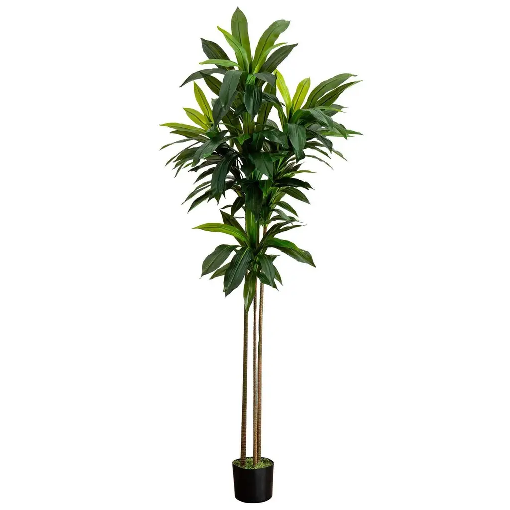 This faux yucca tree plant gives your living room or entryway the lush look of the tropics. It features faux tree stems and yucca tree leaves in natural hues of brown and green that's made from a blend of plastic and silk. It also has small orange flowers for a natural design in your space. This plant is displayed inside a rounded plastic planter in a versatile black finish with a tapered design on the top. And it also comes in a variety of sizes to choose from that best fit your space. Plus, we love that this faux tree doesn't require any maintenance.