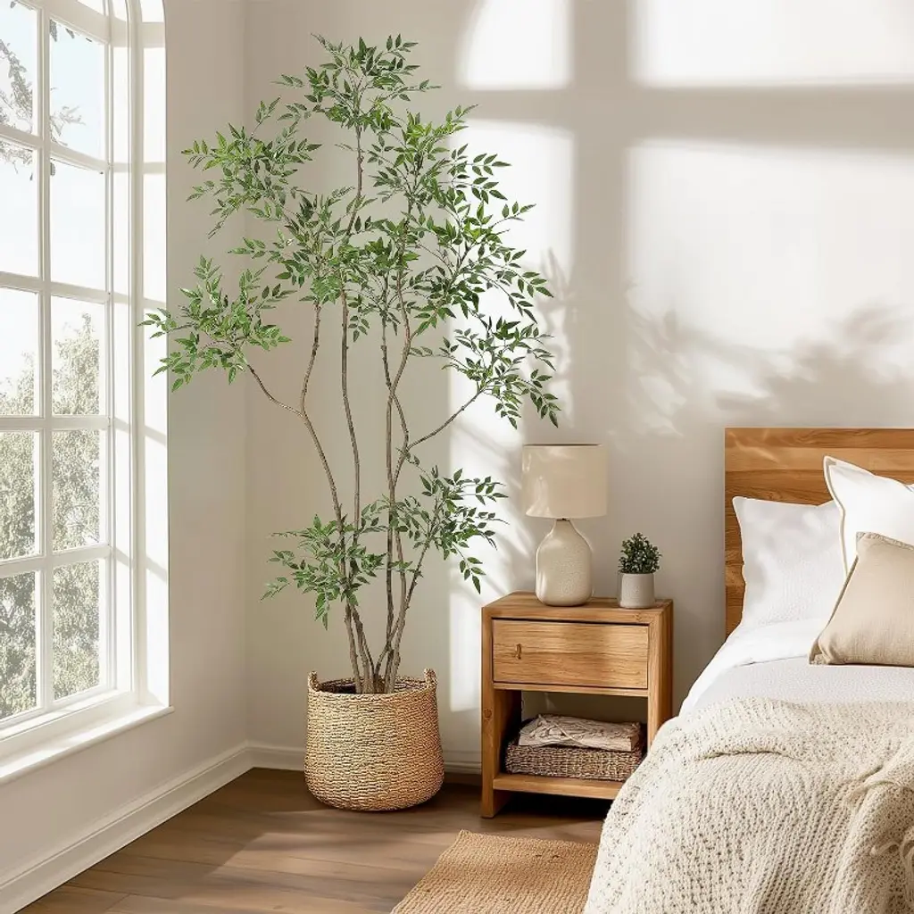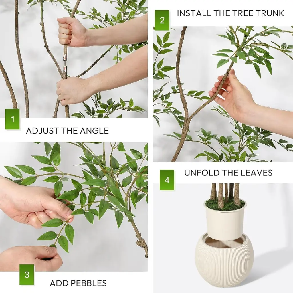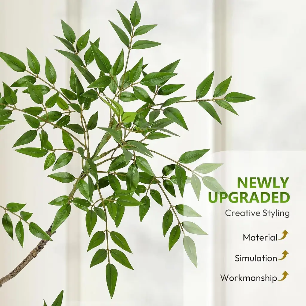 Exquisite Large Planter Included: This faux tree comes with a modern White Imitation Ceramic seamlessly fitting styles from minimalist to modernism.Fake tree decor for home the inner of planter, made of durable clay mix, is topped covered with black pebbles—superior to traditional artificial moss, their curved silhouette adds a timeless and sophisticated touch to both indoor and outdoor spaces Realistic Faux Tropical Plants: Do you want some green to light and refresh your home? This artificial Nandina tree will solve your problem! Elegant artificial plants adopting many leaves situated on several trunks with textured root design and 3D printed realistic leaves, creating a natural plant shape that brings you closer to nature. Suitable for capturing the appearance and feeling of lovely tropical trees anywhere. Perfect Decoration for Indoor: Our lifelike artificial plants will give your home a real boost. They never wilt and look fresh year after year. And if you keep a few faux trees stored away, you can change them up with the seasons or brighten up a room anytime you want. It's a nice fake corner plant decoration for house living room office Easy to Clean: These artificial plants for home decor indoor No sunlight,No watering, No pruning, or day to day care. They maintain their refreshing and vibrant look even in the long run. You can simply wipe them clean and can even cut them to get the look you want Tip:Usually fauxfloor plant need to be reshaped by hand after transport, as some parts of the leaves may be slightly deformed during transport. You can manually reshape artificial tree,just simply bend, separate, and fluff the leaves to achieve desired tree shape and fullnessto create your own tree.