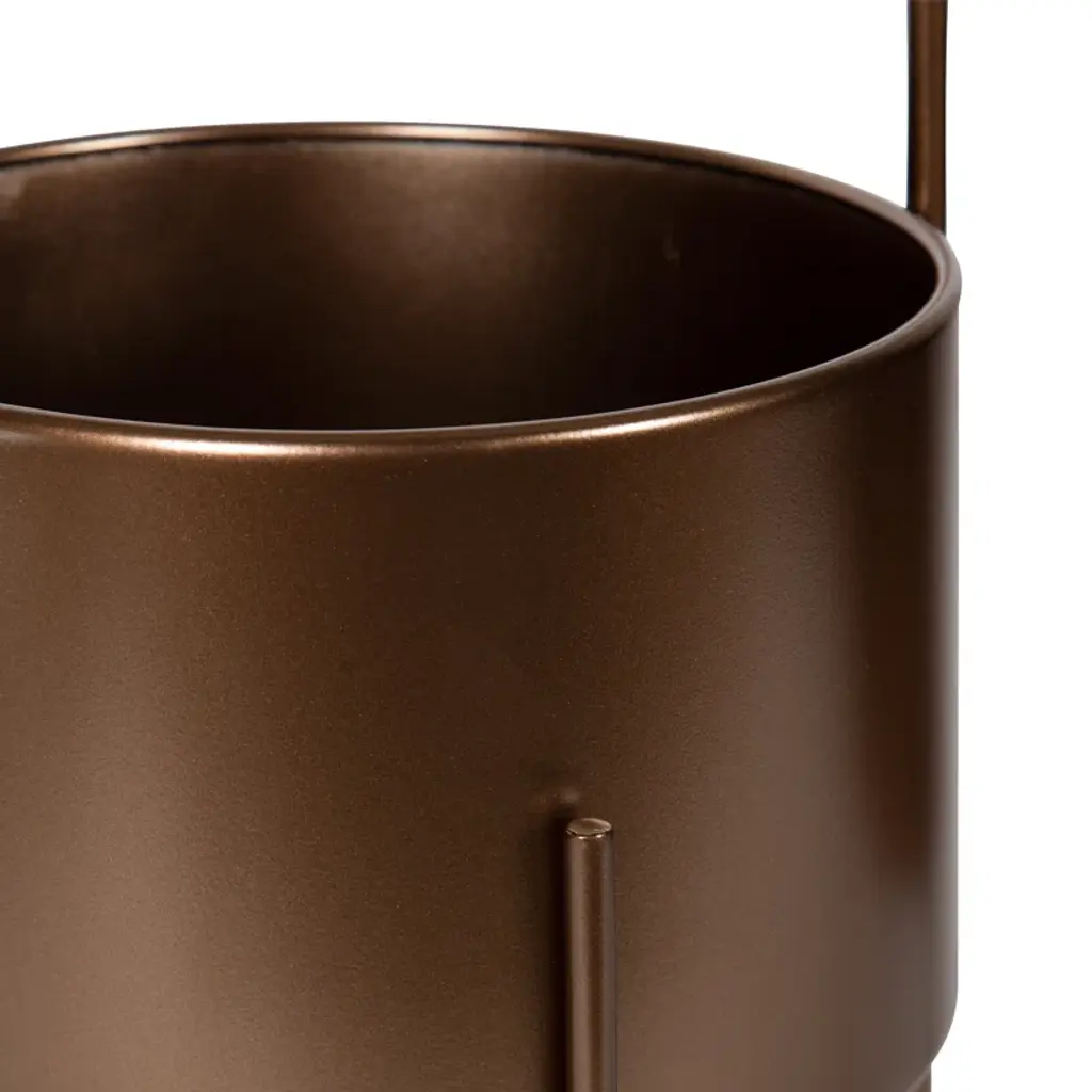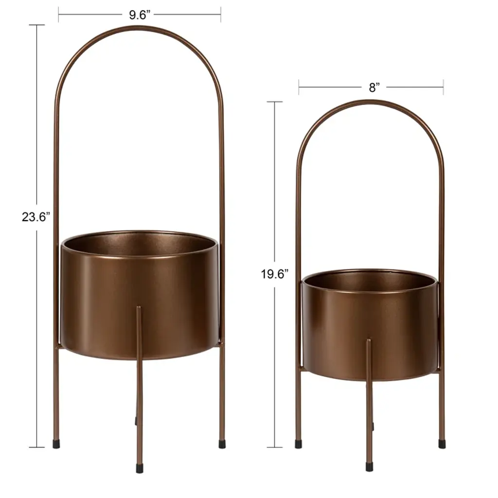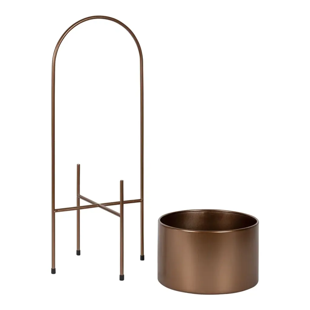 Say hello to greenery goals. A modern touch for your indoor garden, this metallic pot planter is a plant lover's dream. The round silhouette creates a roomy home for your favorite ferns or blossoms. It's crafted from resilient metal, and sits elevated on four sleek legs, two of which form an elegant arch. No drainage holes mean no mess, and the padded feet protect your surfaces. Just add your leafy friends and enjoy your indoor oasis! Plus, it's super simple to keep clean – just wipe with a dry cloth.