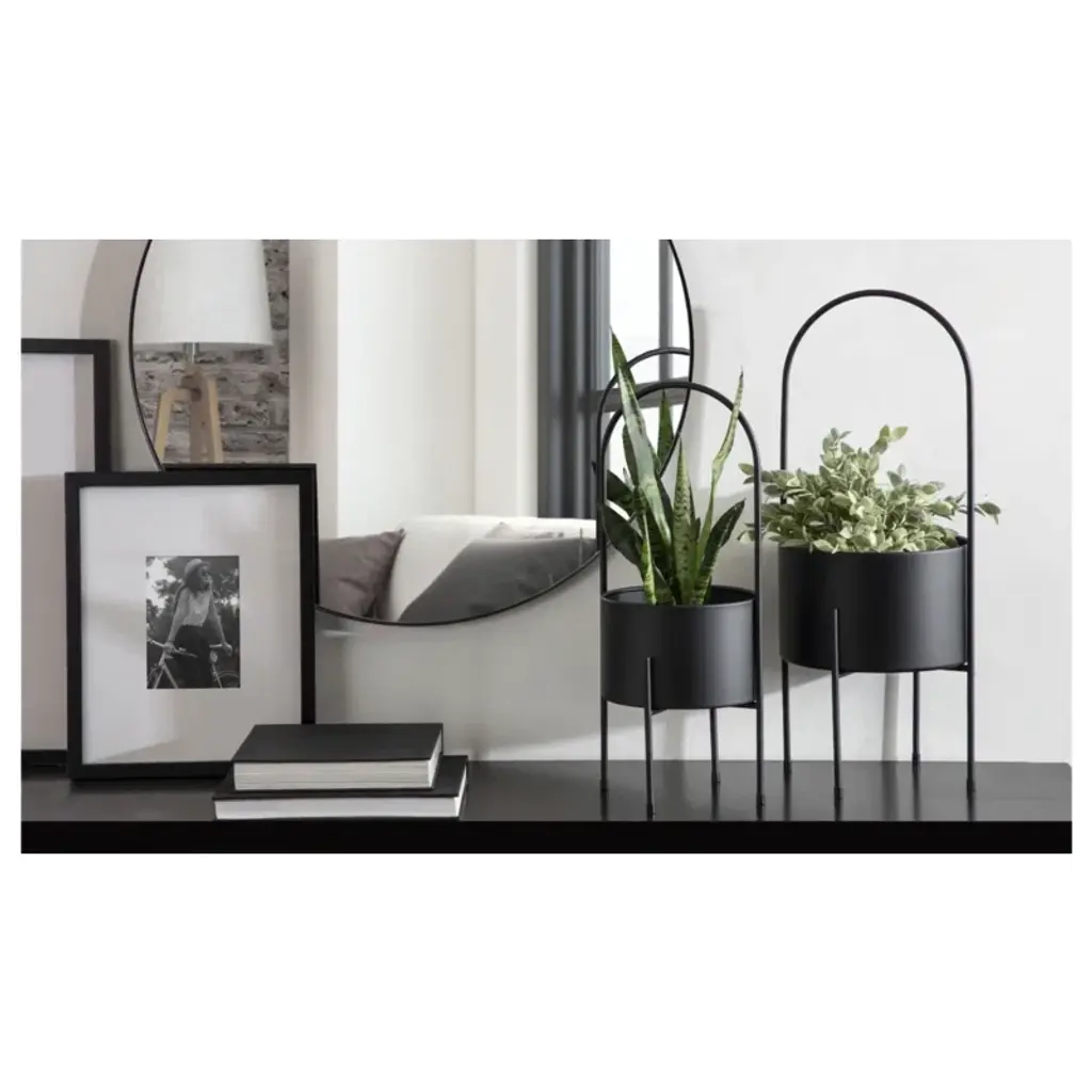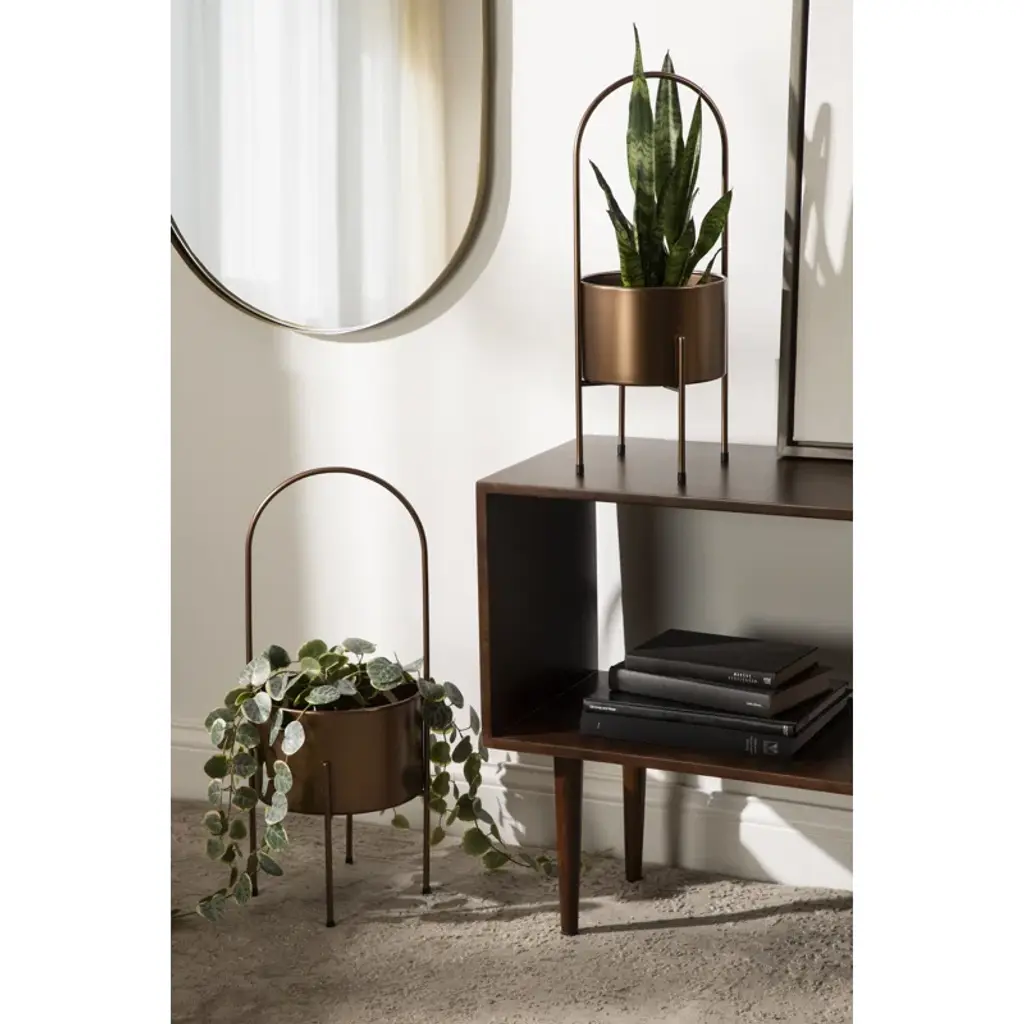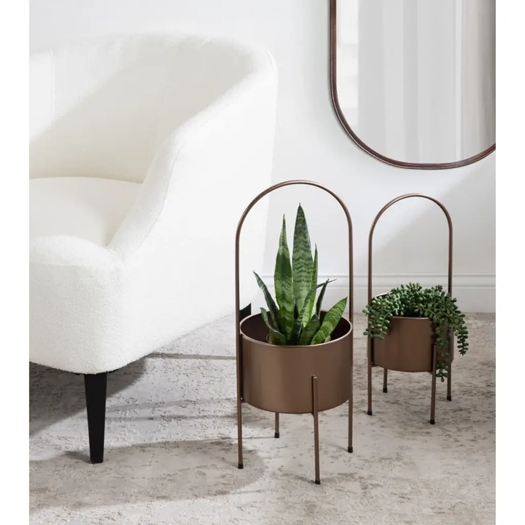 Say hello to greenery goals. A modern touch for your indoor garden, this metallic pot planter is a plant lover's dream. The round silhouette creates a roomy home for your favorite ferns or blossoms. It's crafted from resilient metal, and sits elevated on four sleek legs, two of which form an elegant arch. No drainage holes mean no mess, and the padded feet protect your surfaces. Just add your leafy friends and enjoy your indoor oasis! Plus, it's super simple to keep clean – just wipe with a dry cloth.