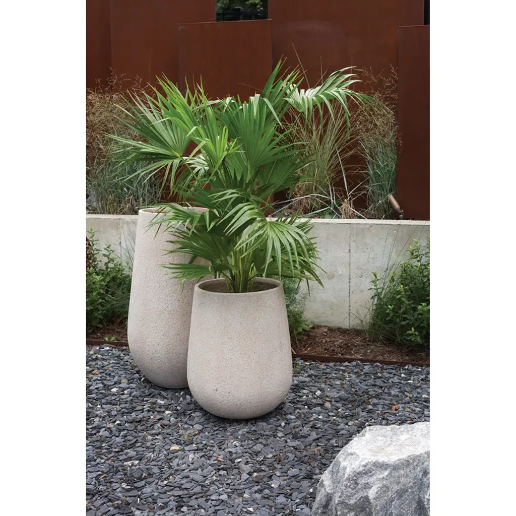 The large Audrina vase is crafted from lightweight poly resin, and designed for outdoor use. Frost resistant and water-safe.
