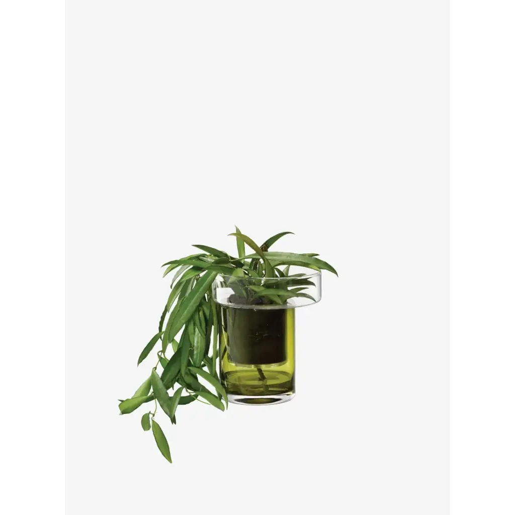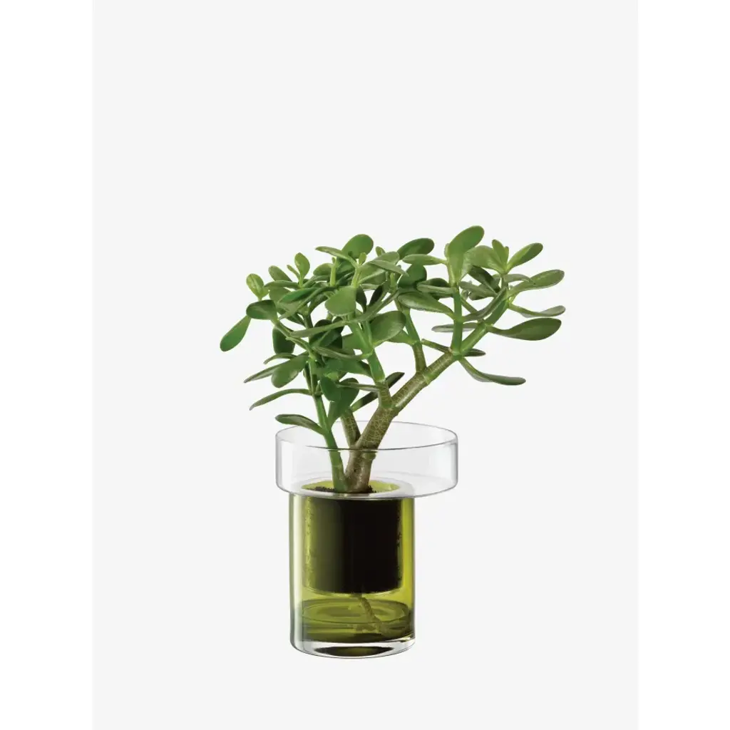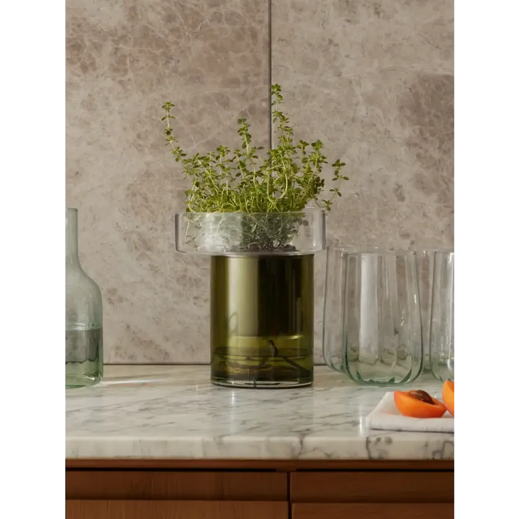 A two-part self-watering glass planter inspired by terraced landscapes and the offset shapes of city balconies. The contemporary shape is designed for indoor planting, with a lower reservoir section for holding water, and an upper section to hold the soil and plants. The two pieces are connected with a cotton trailing cord for delivering water to the roots, using a sub-irrigation and wicking system that puts the soil in contact with the water. As the plant roots absorb water, the soil wicks up more, maintaining a consistent level of moisture in the soil.