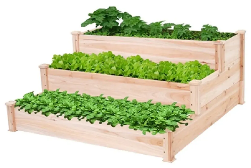 This wooden 3 tires elevated the vegetable bed. This Solid Wood 4 Ft x 4 Ft Raised Garden Bed Planter 3-Tier is perfect for growing your plants and vegetables. With its step stair design, you can place various sized plants inside each level. Each section is approximately 7 inches higher than the next, giving plants ample space between each other to grow efficiently. It can not only be a beautiful decoration of your garden but also can be used as a display stand, storage rack and so on. Solid wood construction makes this vegetable can serve you for a long time. Do not miss this planting box.Features:Solid Wood 4 Ft x 4 Ft Raised Garden Bed Planter 3-TierBrand new and high qualityPerfect for planting vegetables, herbs, and flowersSolid wood construction, serve you for a long time3 sections for planting different plantsEnough space giving plants ample space between each other to growSimple assemble need Material: CedarwoodThickness of wood panel: 0.5"Package include: 1 x 3 Tires vegetable planterDimensions:48.5" x 48.5" x 21.7"(L x W x H)Min box dimension: 47.0" x 16.7" x 7.0"(L x W)Middlebox dimension: 47.0" x 32.5" x 7.0"(L x W)Max box dimension: 47.0" x 47.0" x 7.0"( L x W)Weight: 31lbs.