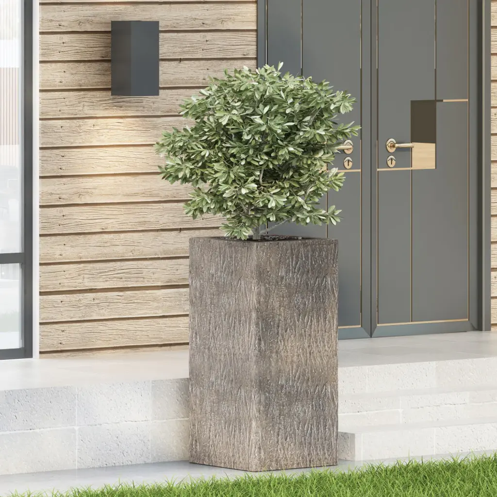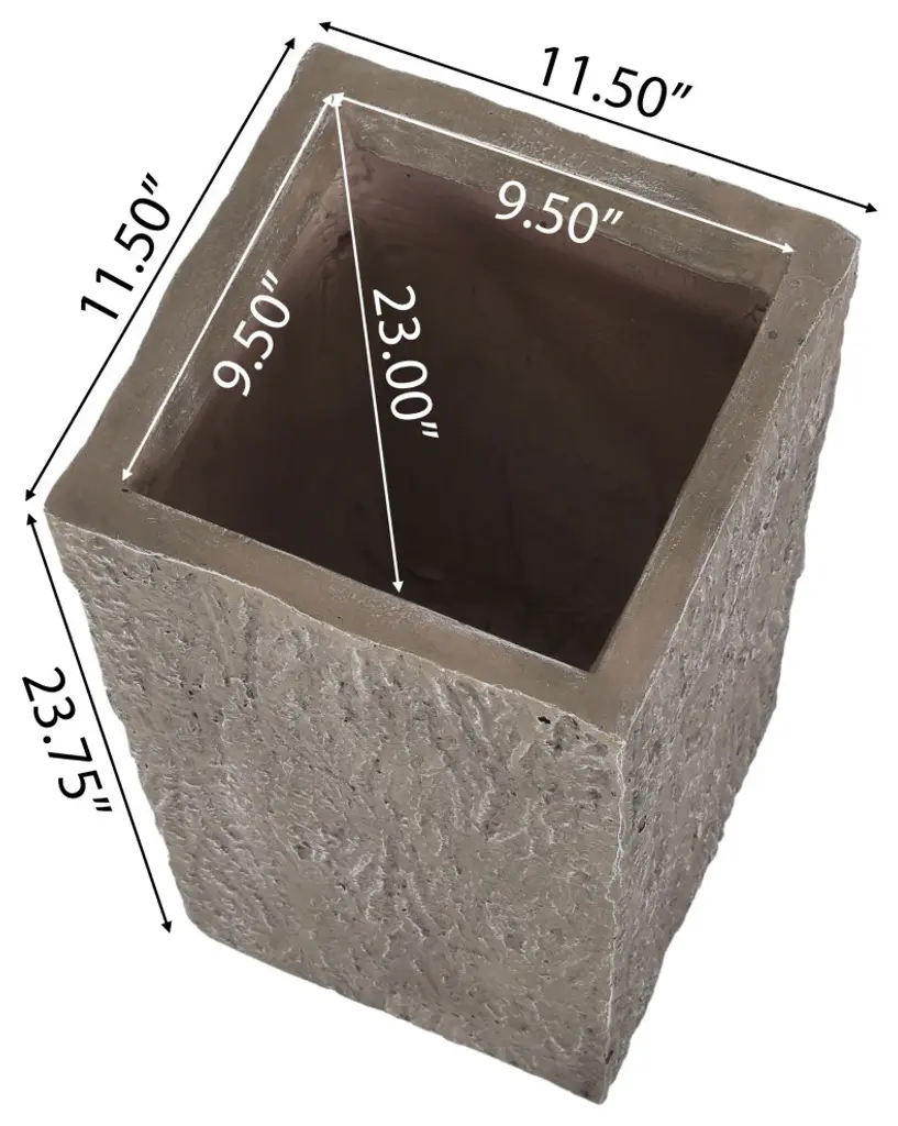 Offer your outdoor space a pop of natural style with the perfect accessory. From its stunning wood texture to its lightweight concrete structure, our tall box planter will instantly enhance your patio or backyard space with style. This accessory offers a durable construction to ensure that your plant has a stable home to grow. Complemented with a brown wood finish, this planter offers a classic look to your garden or porch. Perfectly crafted to hold your plants, this piece is the perfect accessory for your green thumb.• • A TOUCH OF PERSONALITY: Bring your outdoor area to life with our delightful cast stone planter. With a tall box structure, this accessory will not only enliven your backyard or patio space but also provides space to grow plants.• • CAST STONE: Constructed with lightweight concrete, this planter offers a natural stone look with a beautiful brown wood texture that also has a highly durable structure and is resistant to outdoor elements.• • DRAINAGE HOLE INCLUDED: This planter includes a drainage hole at the bottom so that excess water will not pool. This prevents water from becoming stagnant, which promotes healthier roots.• • THREE SIZES: Choose among three different sizes for an accessory that is perfect for you and your outdoor space. The large planter is 14.25" W x 14.25" D x 28.00" H, the medium planter is 11.50" W x 11.50" D x 23.75" H, and the small planter is 8.75" W x 8.75" D x 20.00" H. You will love how much your space can transform with the simple addition of this accessory.• • NO ASSEMBLY: This planter comes ready to use straight out of the box. No assembly is required.Includes: One (1) Planter• Material: Lightweight Concrete• Finish: Brown Wood• No Assembly Required• Large Dimensions: 14.25 inches deep x 14.25 inches wide x 28.00 inches high• Large Inner Dimensions: 12.50 inches deep x 12.50 inches wide x 27.00 inches high• Medium Dimensions: 11.50 inches deep x 11.50 inches wide x 23.75 inches high• Medium Inner Dimensions: 9.50 inches deep x 9.50 inches wide x 23.00 inches high• Small Dimensions: 8.75 inches deep x 8.75 inches wide x 20.00 inches high• Small Inner Dimensions: 6.75 inches deep x 6.75 inches wide x 19.50 inches high