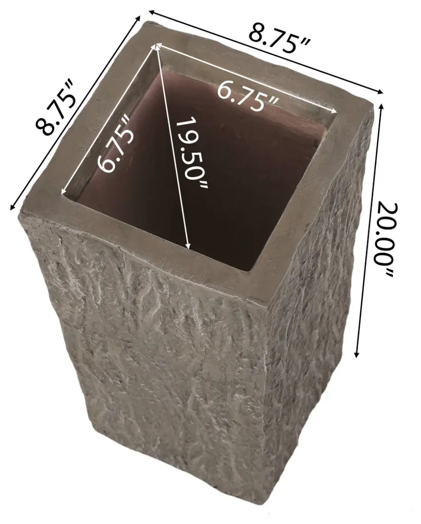 Offer your outdoor space a pop of natural style with the perfect accessory. From its stunning wood texture to its lightweight concrete structure, our tall box planter will instantly enhance your patio or backyard space with style. This accessory offers a durable construction to ensure that your plant has a stable home to grow. Complemented with a brown wood finish, this planter offers a classic look to your garden or porch. Perfectly crafted to hold your plants, this piece is the perfect accessory for your green thumb.• • A TOUCH OF PERSONALITY: Bring your outdoor area to life with our delightful cast stone planter. With a tall box structure, this accessory will not only enliven your backyard or patio space but also provides space to grow plants.• • CAST STONE: Constructed with lightweight concrete, this planter offers a natural stone look with a beautiful brown wood texture that also has a highly durable structure and is resistant to outdoor elements.• • DRAINAGE HOLE INCLUDED: This planter includes a drainage hole at the bottom so that excess water will not pool. This prevents water from becoming stagnant, which promotes healthier roots.• • THREE SIZES: Choose among three different sizes for an accessory that is perfect for you and your outdoor space. The large planter is 14.25" W x 14.25" D x 28.00" H, the medium planter is 11.50" W x 11.50" D x 23.75" H, and the small planter is 8.75" W x 8.75" D x 20.00" H. You will love how much your space can transform with the simple addition of this accessory.• • NO ASSEMBLY: This planter comes ready to use straight out of the box. No assembly is required.Includes: One (1) Planter• Material: Lightweight Concrete• Finish: Brown Wood• No Assembly Required• Large Dimensions: 14.25 inches deep x 14.25 inches wide x 28.00 inches high• Large Inner Dimensions: 12.50 inches deep x 12.50 inches wide x 27.00 inches high• Medium Dimensions: 11.50 inches deep x 11.50 inches wide x 23.75 inches high• Medium Inner Dimensions: 9.50 inches deep x 9.50 inches wide x 23.00 inches high• Small Dimensions: 8.75 inches deep x 8.75 inches wide x 20.00 inches high• Small Inner Dimensions: 6.75 inches deep x 6.75 inches wide x 19.50 inches high