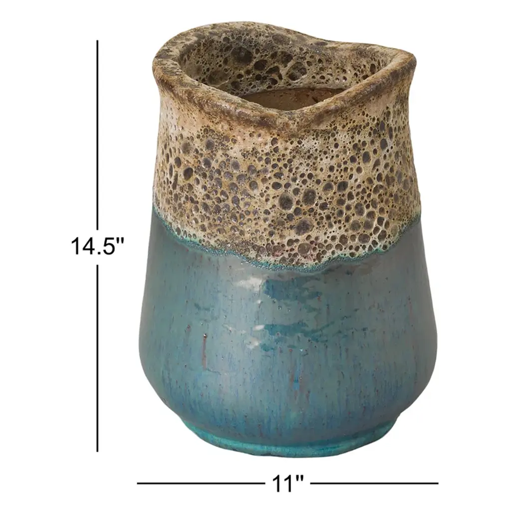 A unique shape with a reef and teal glaze. The reef finish on the rim gives the piece an unusual textured aesthetic. This will be a conversation piece in your home or garden.