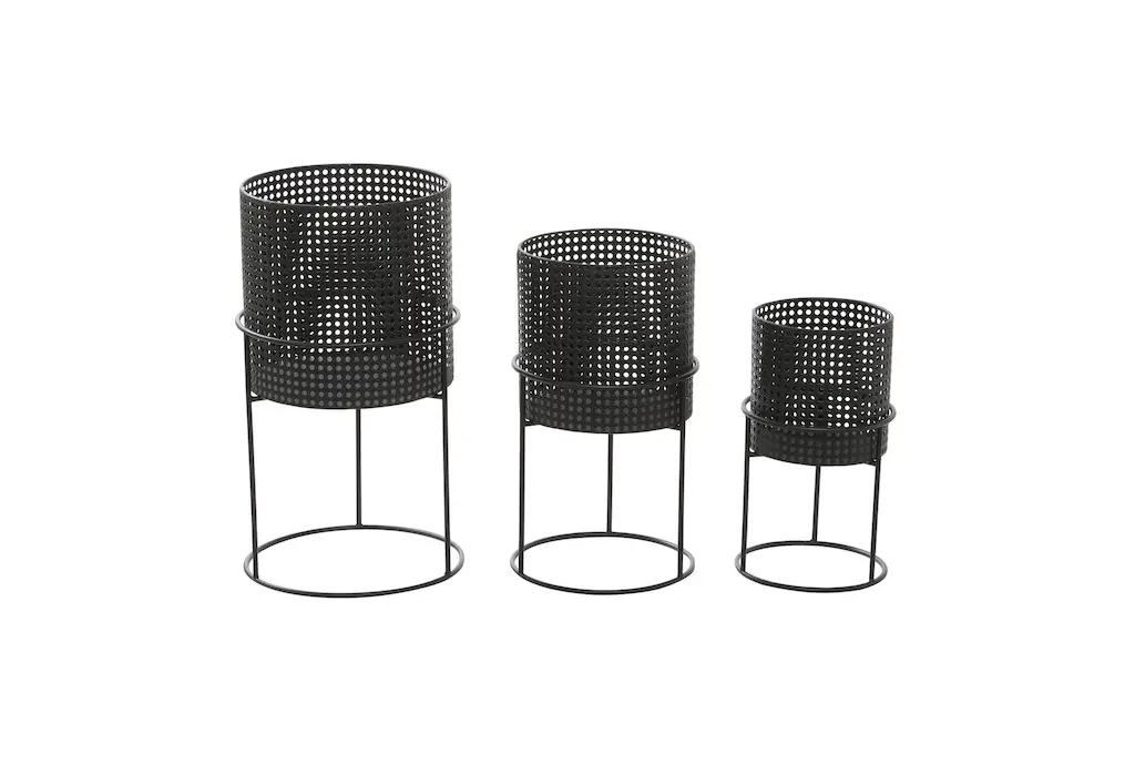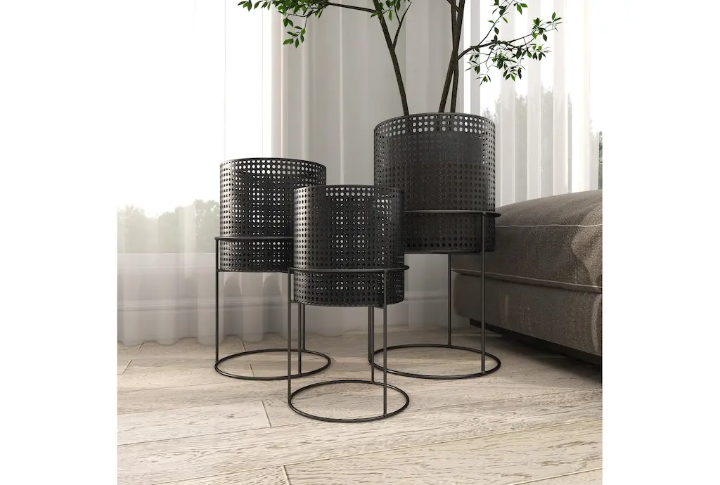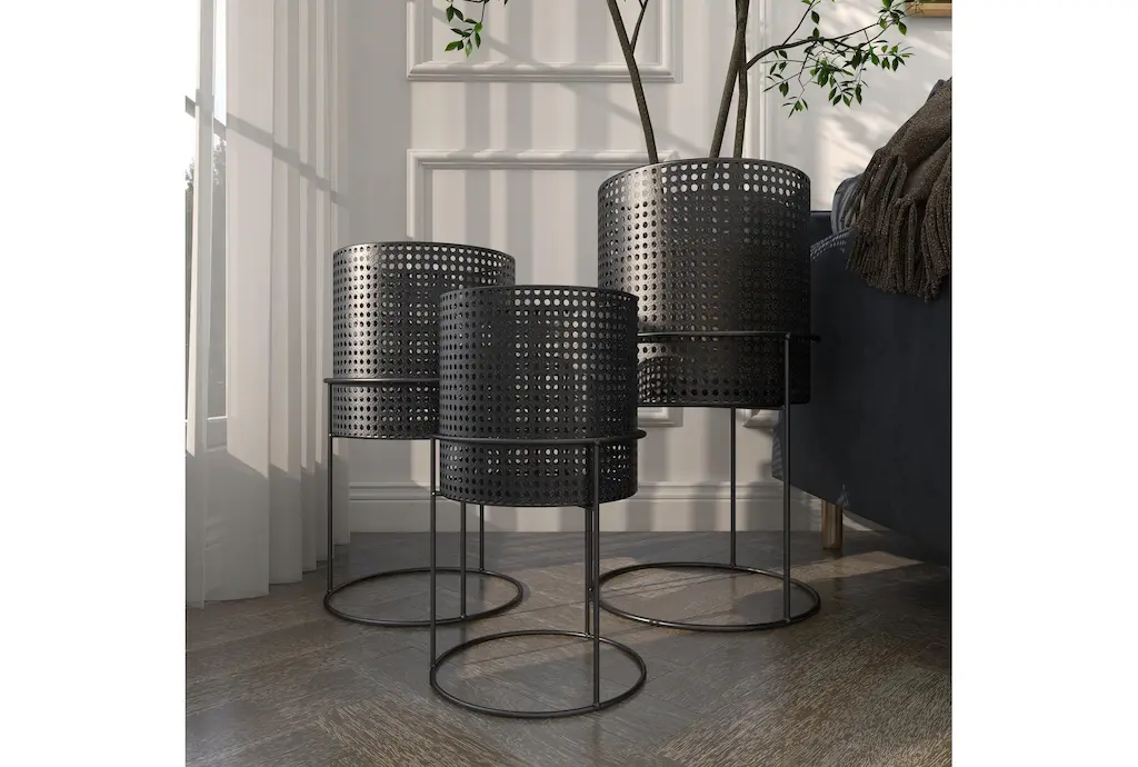 The simple yet bold design of this set of planters makes it an instant conversation piece and a gorgeous accent decor for your home. This item ships in 1 carton. Please note that this item is for decorative use only. Suitable for indoor and outdoor use. This item ships fully assembled in one piece. Maximum weight limit is 5 lbs. Planters do not have drainage holes but they are not watertight. This black colored plant pot comes as a set of 3. Contemporary style.