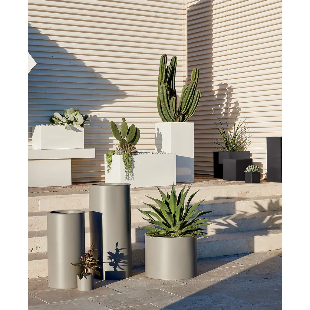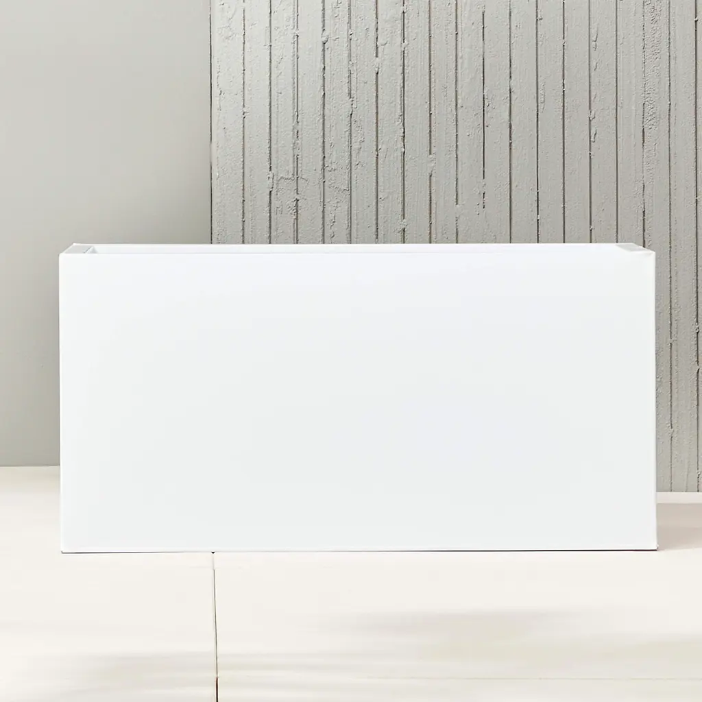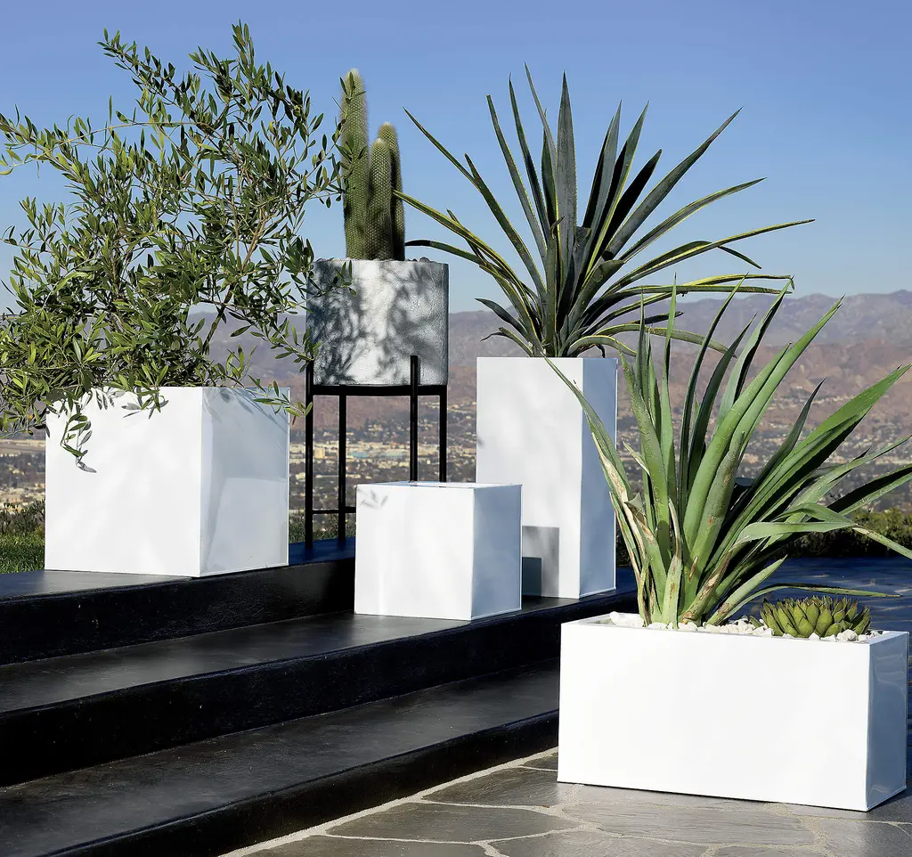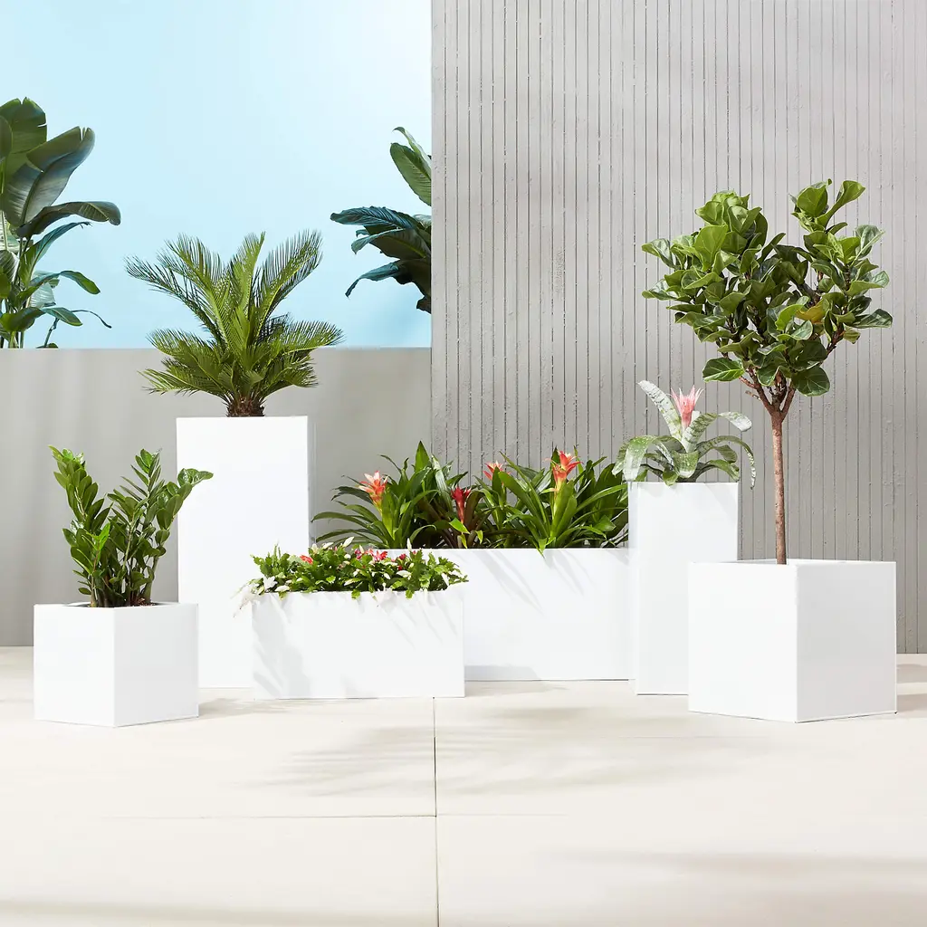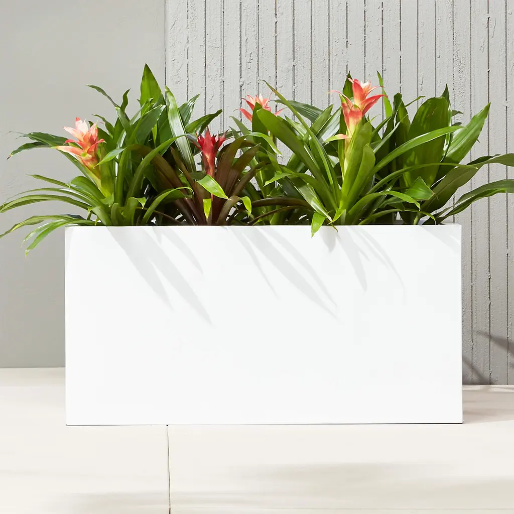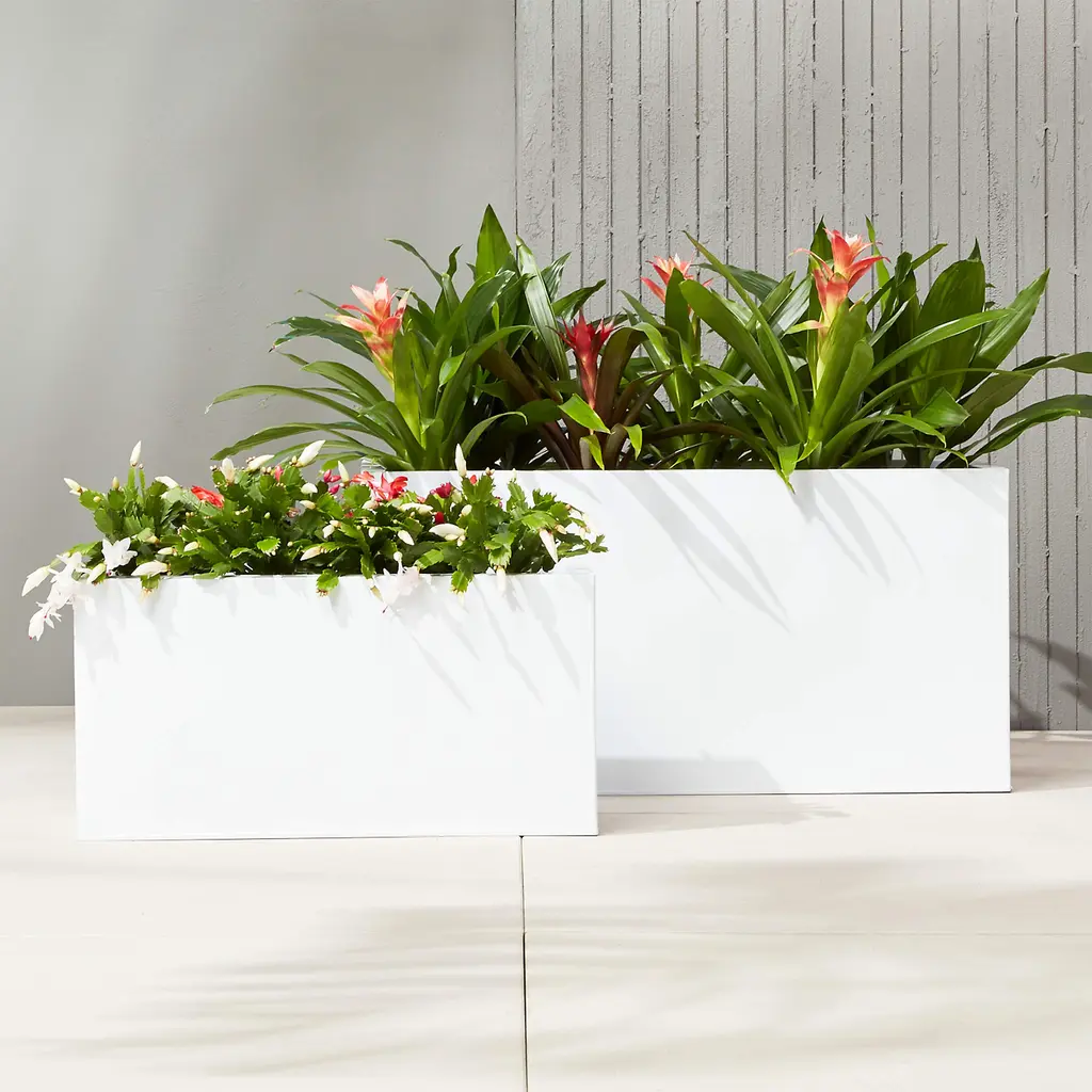 Bright white rectangular planters square up sleek and modern. Protected for indoor and outdoor settings, hi-gloss lacquered galvanized steel plays up refined industrial to dramatic effect.
