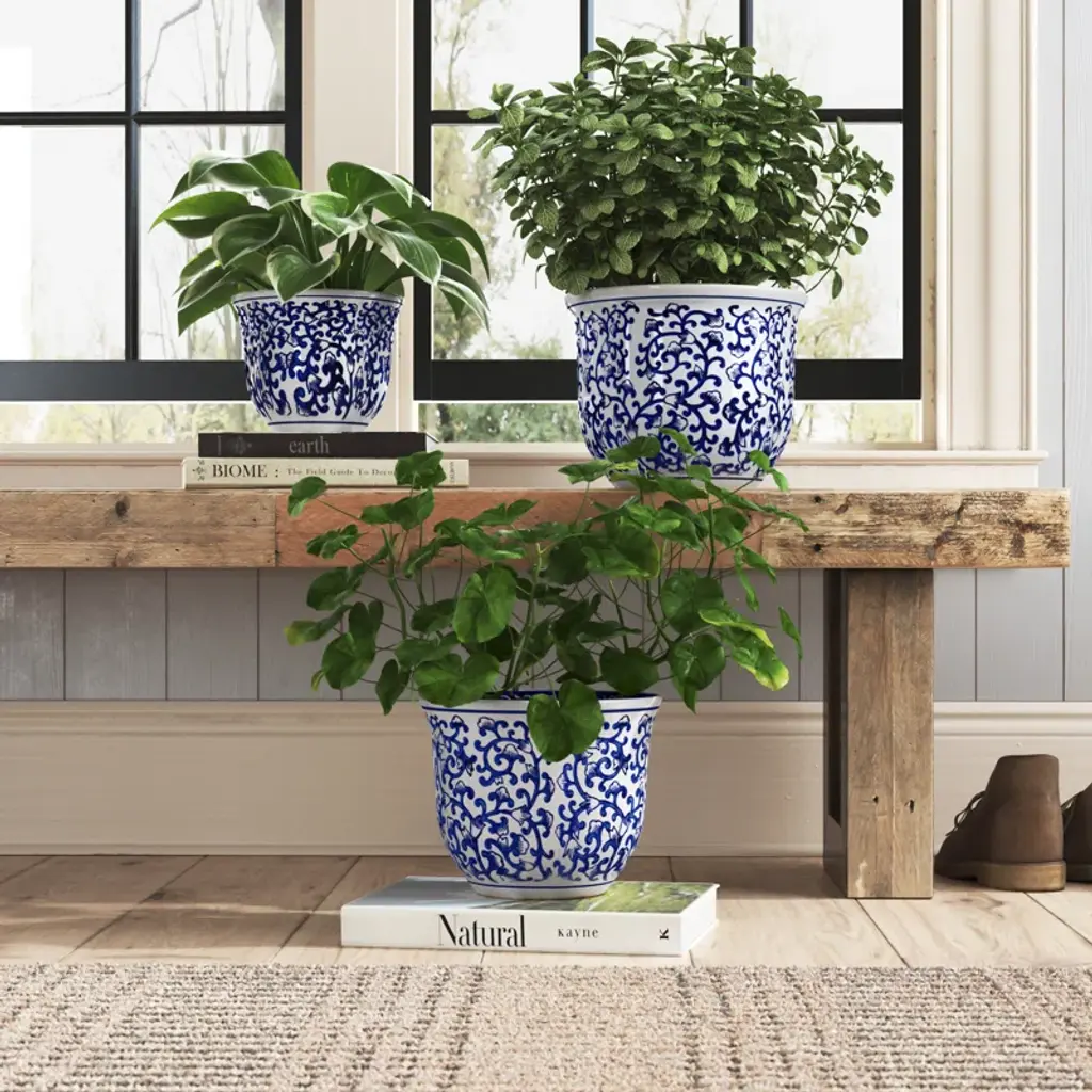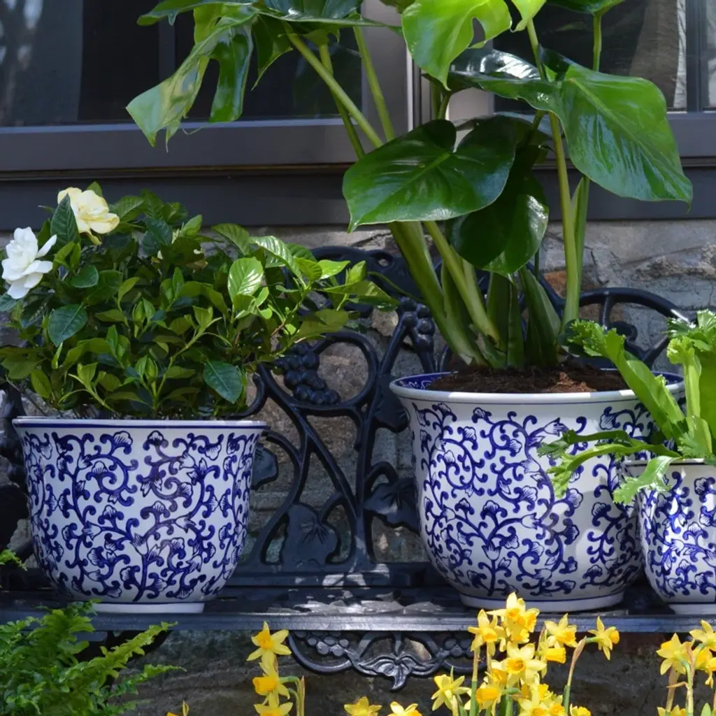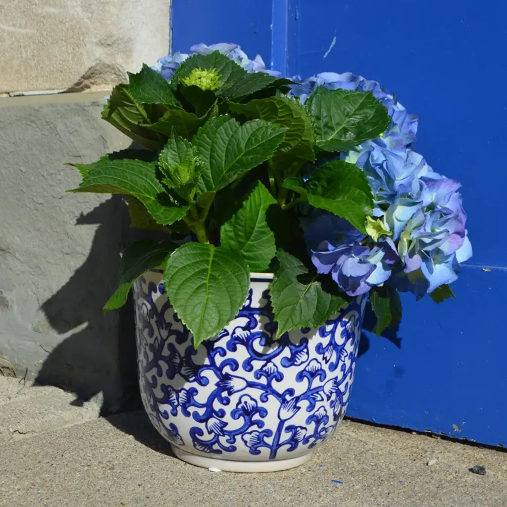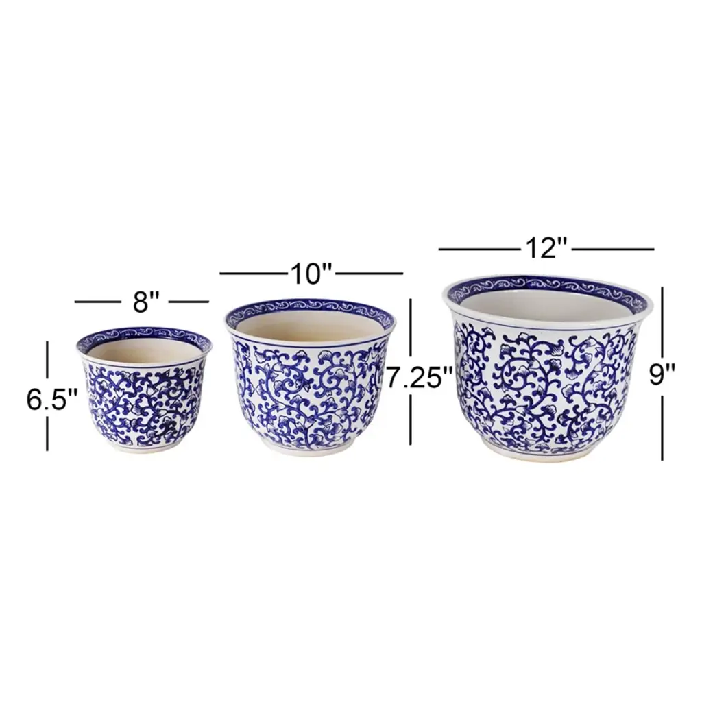 The meandering vine pattern of these inverted bell shaped planters is reminiscent of the tapestries of the Florentine Renaissance. The blue on white design is a perennial favorite of decorating and looks chic in a wide variety of settings. The useful shape and sizes are the ideal home to your indoor plants.