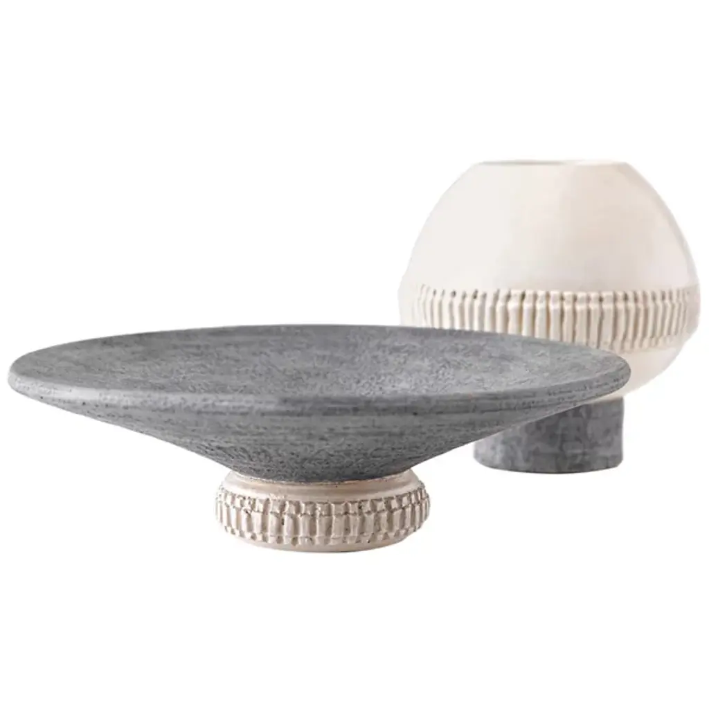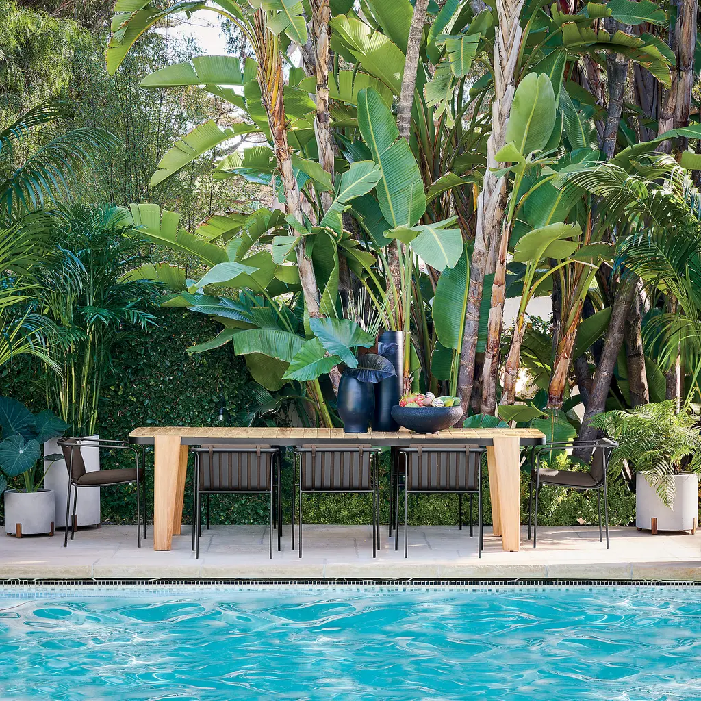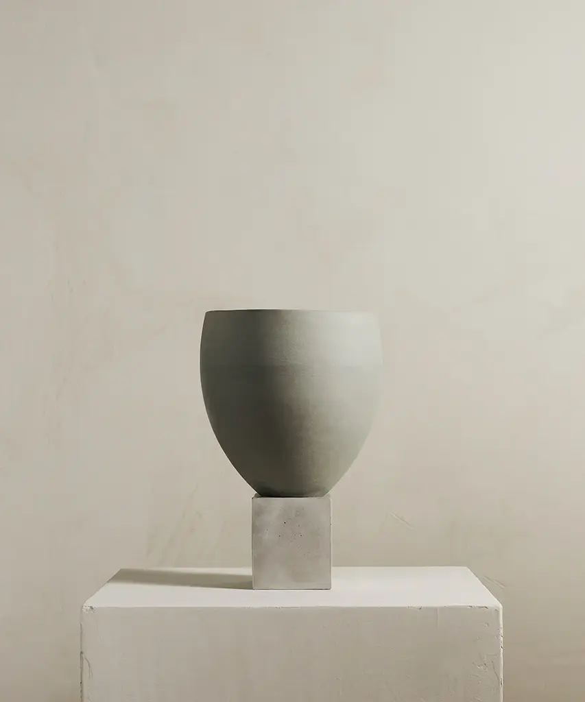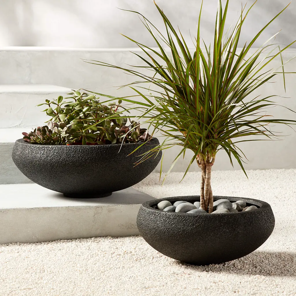 Black resin concrete composite planter surfaces a pebbled texture that looks so at home outdoors. Opens wide for botanicals, doubles as decorative bowl. CB2 exclusive.