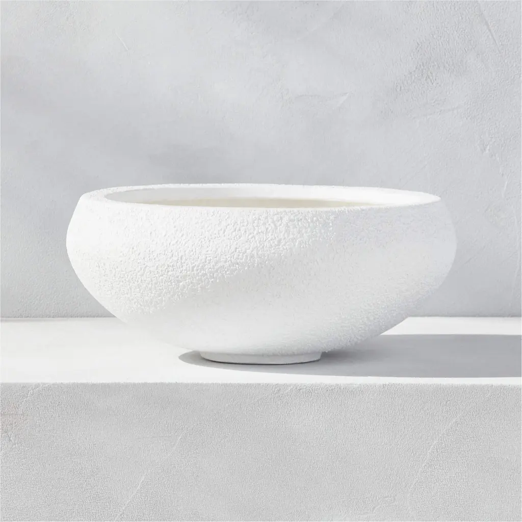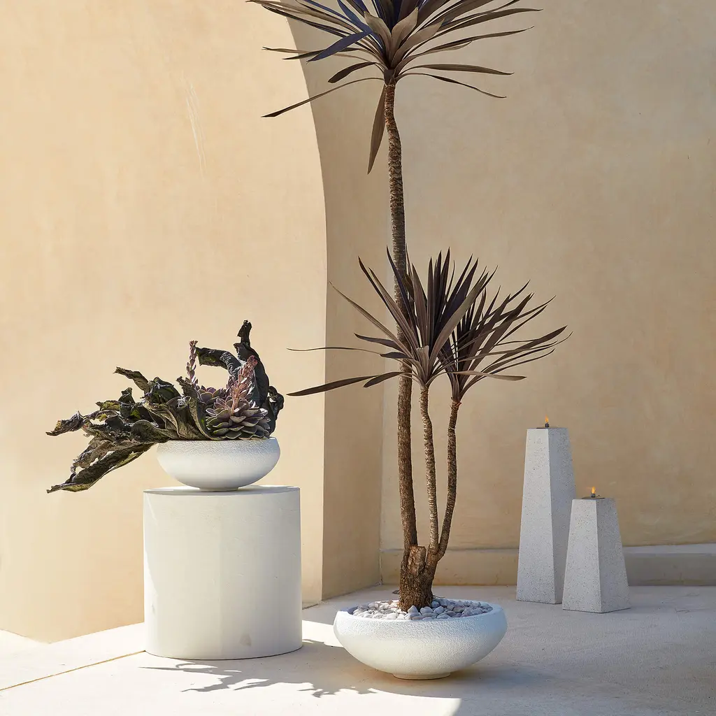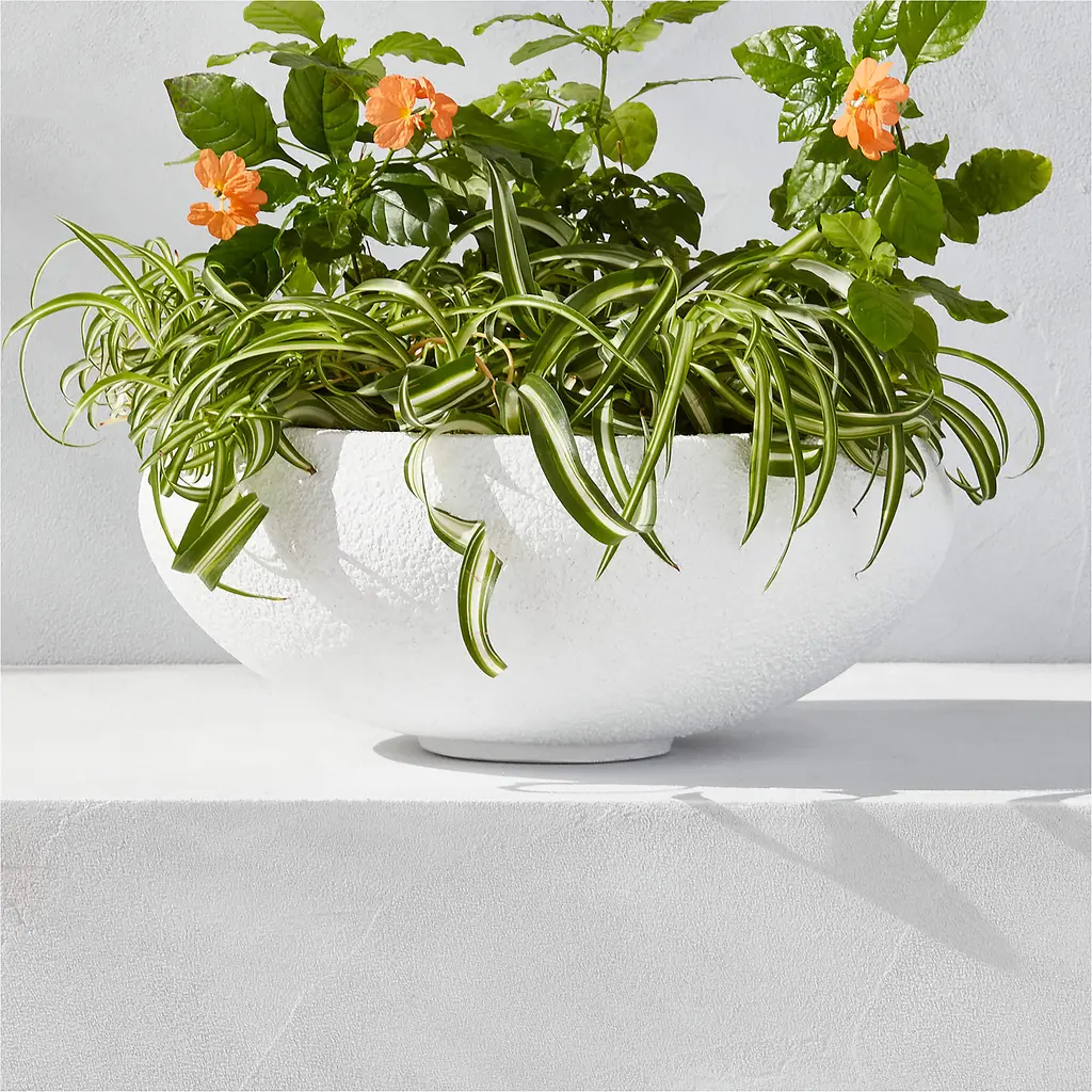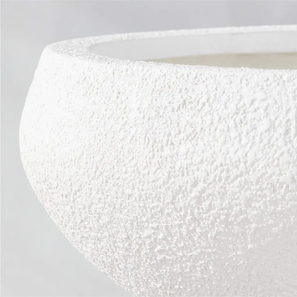 White resin concrete composite planter has a pebbled texture that looks so at home outdoors. Opens wide for botanicals; doubles as a decorative bowl. CB2 exclusive.