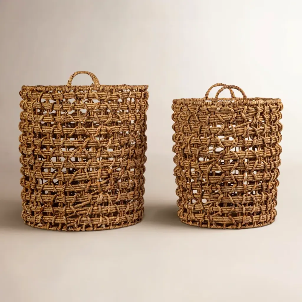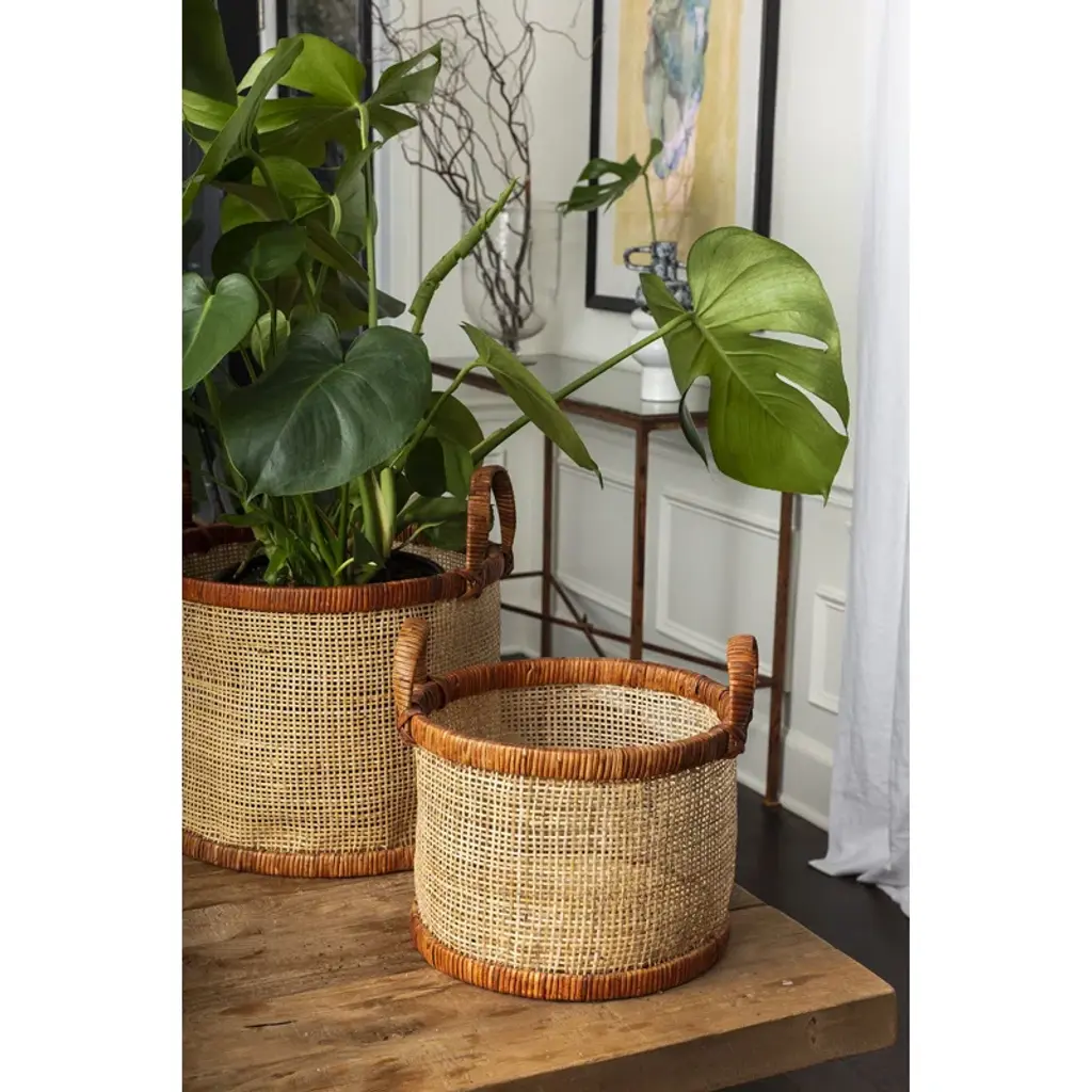 Woven from natural cane with contrasting trim, this two-piece basket set offers easy organization + earthy boho style. Handles make them convenient to tote from room to room, and they nest to save space when they’re not in use. Neutral tones + organic fibers make them a great way to dress up your favorite houseplants.