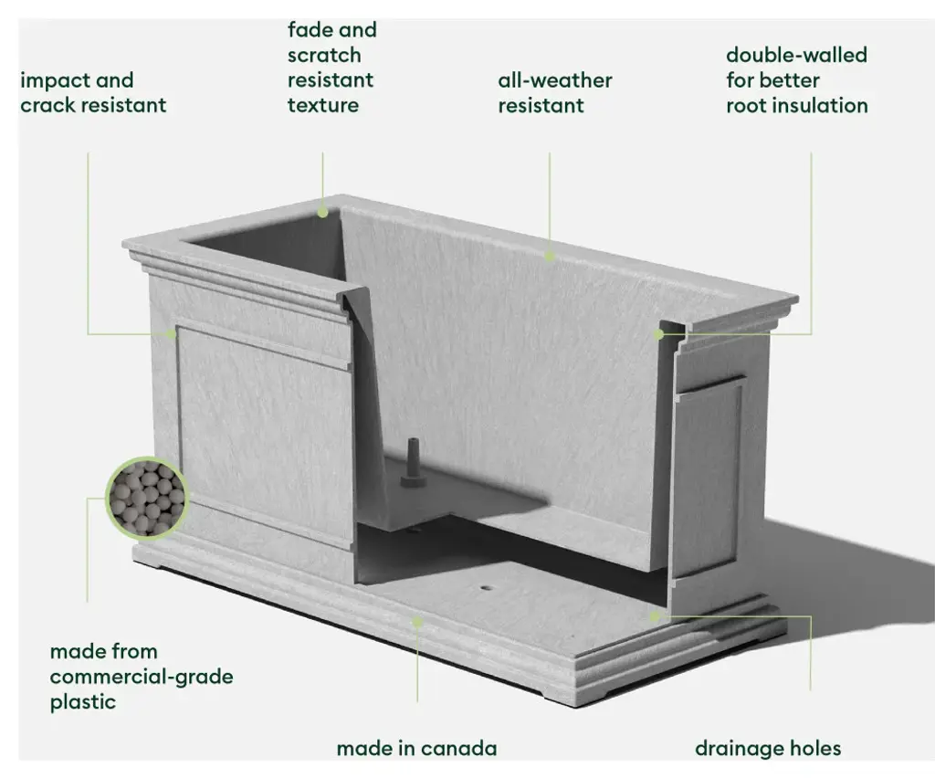Old meets new. Inspired by lush estate gardens, the Veradek Brixton Long Planter combines traditional design with modern technology making it best suited for the backyard or patio. Featuring a removable insert bucket, the Brixton Long makes it easy to switch out plants, flowers or shrubs and pre-drilled drainage holes help prevent overwatering. This sturdy yet lightweight rectangular planter is proudly crafted in Canada from high-grade recycled plastic, making it resistant to cracks, fading and UV and allowing it to withstand extreme temperatures ranging from -20 to +120 degrees. With the perfect balance of design, structure and purpose, the Brixton Long pairs perfectly with any indoor or outdoor arrangement, any season.