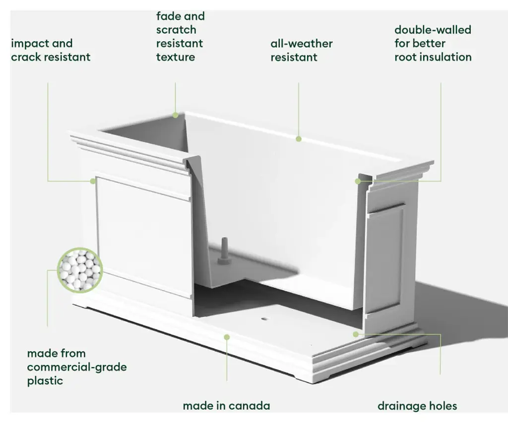 Old meets new. Inspired by lush estate gardens, the Veradek Brixton Long Planter combines traditional design with modern technology making it best suited for the backyard or patio. Featuring a removable insert bucket, the Brixton Long makes it easy to switch out plants, flowers or shrubs and pre-drilled drainage holes help prevent overwatering. This sturdy yet lightweight rectangular planter is proudly crafted in Canada from high-grade recycled plastic, making it resistant to cracks, fading and UV and allowing it to withstand extreme temperatures ranging from -20 to +120 degrees. With the perfect balance of design, structure and purpose, the Brixton Long pairs perfectly with any indoor or outdoor arrangement, any season.