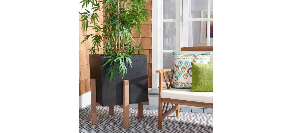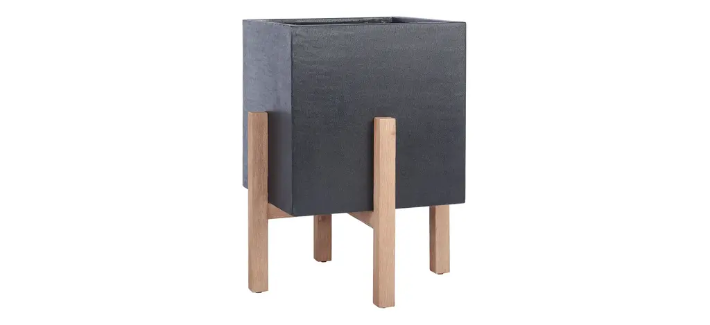The Brizio planter brings sleek minimalism to the great outdoors. Brizio's stark angles pair well with the organic shapes of flowers, giving any porch or patio a touch of modern chic. The black hue of its concrete cube highlights the natural finish on its acacia legs.