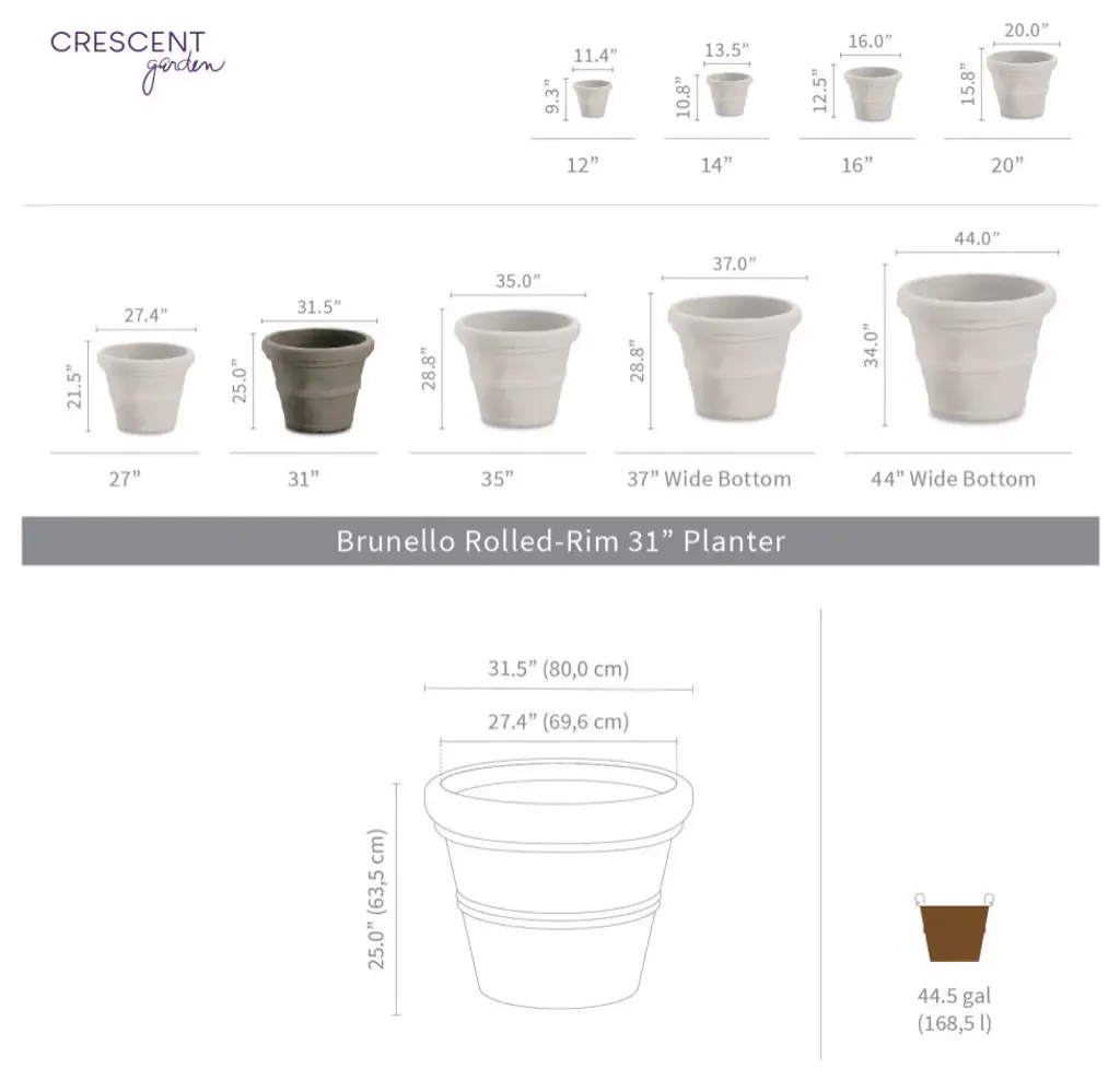 Make your knack for a green thumb easier by displaying your plants in this timeless Brunello Planter from Crescent Garden. This extra-large gardening pot is as simple as it gets - with the subtle design and lightweight construction, it won''t take away from the rest of your home decor style, and moving it from room to room will be a breeze. Whether you use it to display flowers or your favorite plants, the option of various sizes and colors will fit right into your home.- LIGHTWEIGHT AND DURABLE: Constructed with 100% recyclable rotation molded polyethylene, this traditional container pot is lightweight, chip-resistant and durable. - WEATHER-RESISTANT: The sturdy UV-resistant structure ensures the planter won''t fade or crack during extreme temperatures, ideal for your gardening experience all year round.- INDOOR/OUTDOOR: Environmentally friendly and food-safe planter for accenting with plants in your indoor space and for your outdoor gardening needs.- 10-Year Limited Warranty- DRAINAGE HOLE: Pre-drilled drainage hole for healthier root growth. - DIMENSIONS: Inner Dimension - 27.4"W x 25" H / Outer Size : 31.5" W x 25" / Base: 17.8"/ Soil capacity: 44.5 gal
