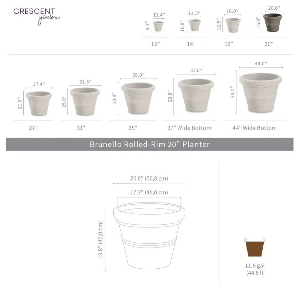 Make your knack for a green thumb easier by displaying your plants in this timeless Brunello Planter from Crescent Garden. This gardening pot is as simple as it gets - with the subtle design and lightweight construction, it won''t take away from the rest of your home decor style, and moving it from room to room will be a breeze. Whether you use it to display flowers or a group of succulents, the option of various sizes and colors will fit right into your home.- LIGHTWEIGHT AND DURABLE: Constructed with 100% recyclable rotation molded polyethylene, this traditional container pot is lightweight, chip-resistant and durable. - WEATHER-RESISTANT: The sturdy UV-resistant structure ensures the planter won''t fade or crack during extreme temperatures, ideal for your gardening experience all year round.- INDOOR/OUTDOOR: Environmentally friendly and food-safe planter for your stylish indoor space and for your outdoor gardening needs.- 10-Year Limited Warranty- DRAINAGE HOLE: Pre-drilled drainage hole for healthier root growth. - DIMENSIONS: Inner Dimension - 17.7"W x 15.8" H / Outer Size : 20" W x 15.8" / Base: 12"/ Soil capacity: 11.8 gal
