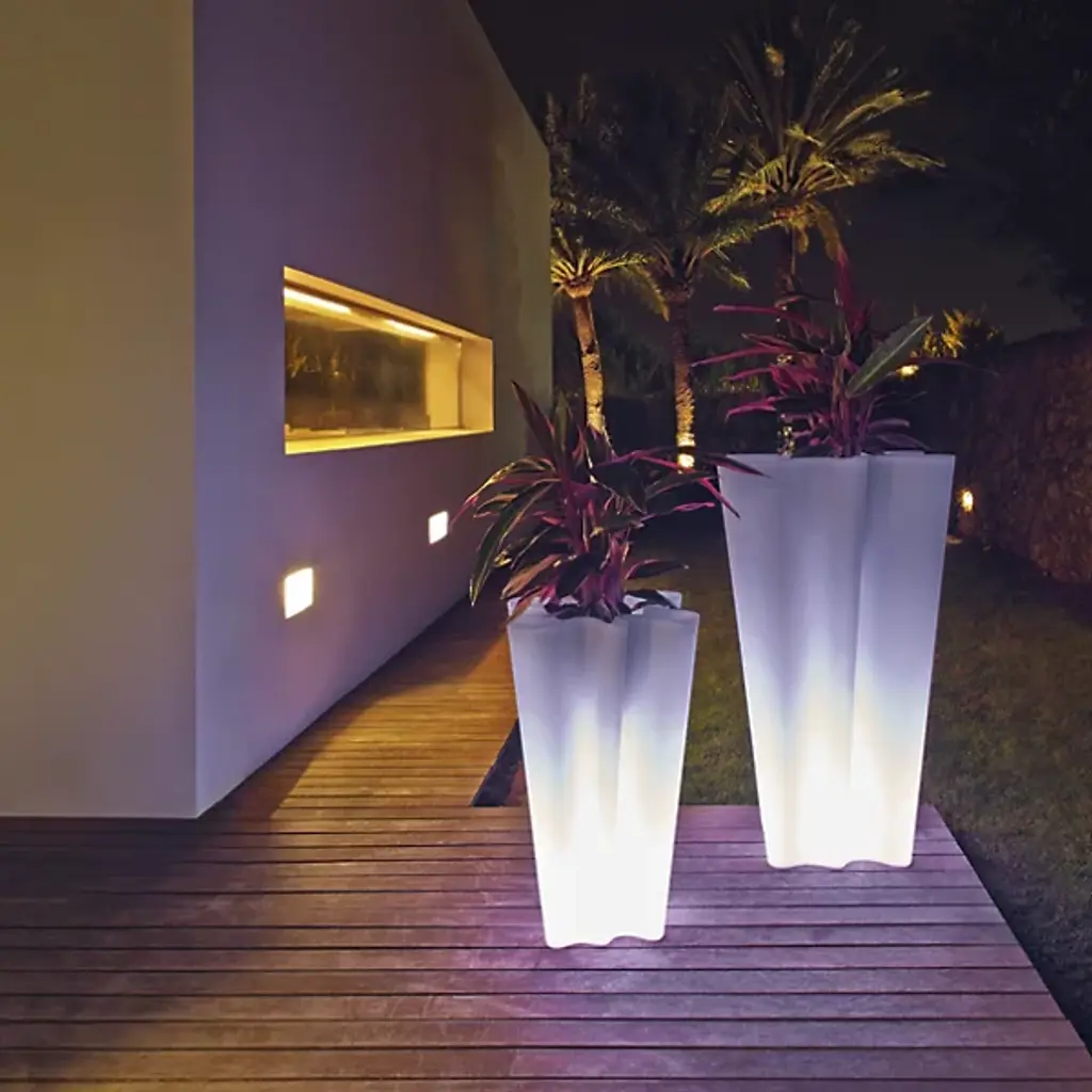 Say hello to your new favorite planter. The Bye-Bye Outdoor Planter by Vondom is a fluid piece molded of a single piece of 100% recyclable polyethylene. From the side, the profile appears clean and geometric, flowing gently upward and outward. But that initial impression is immediately altered when viewed from above. Playful folds curve in and around like an amoeba, making this piece an artful and animated centerpiece for indoor or outdoor container gardens. Designed by Harry Paul and Camila Vega.