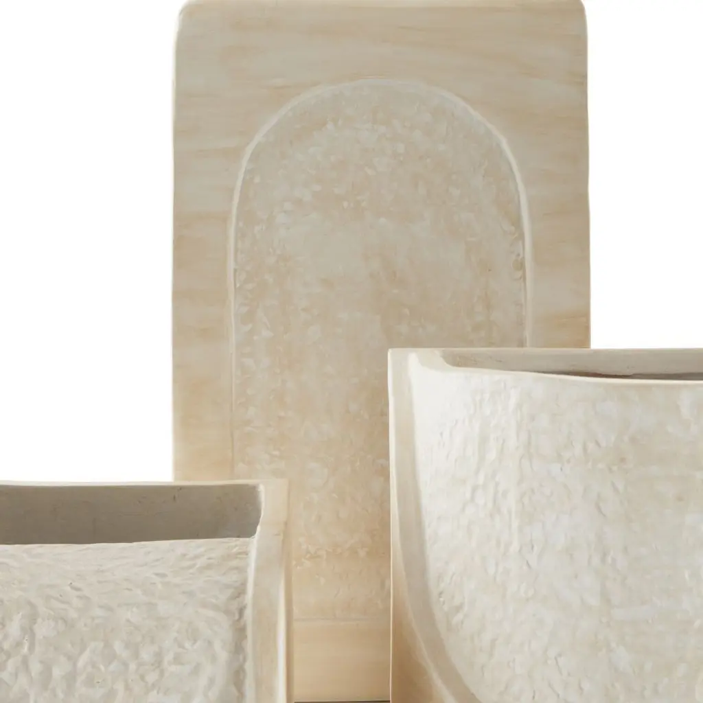 Ancient Greek columns inform the clean lines of classical terra cotta planters. Adorned with arched details and glazed in ivory, the carefully crafted finish lends an organic feel to each rigid structure. Designed with a clear rubber stopper at each base to provide an elegant home for greenery or flowers. Finish will vary.