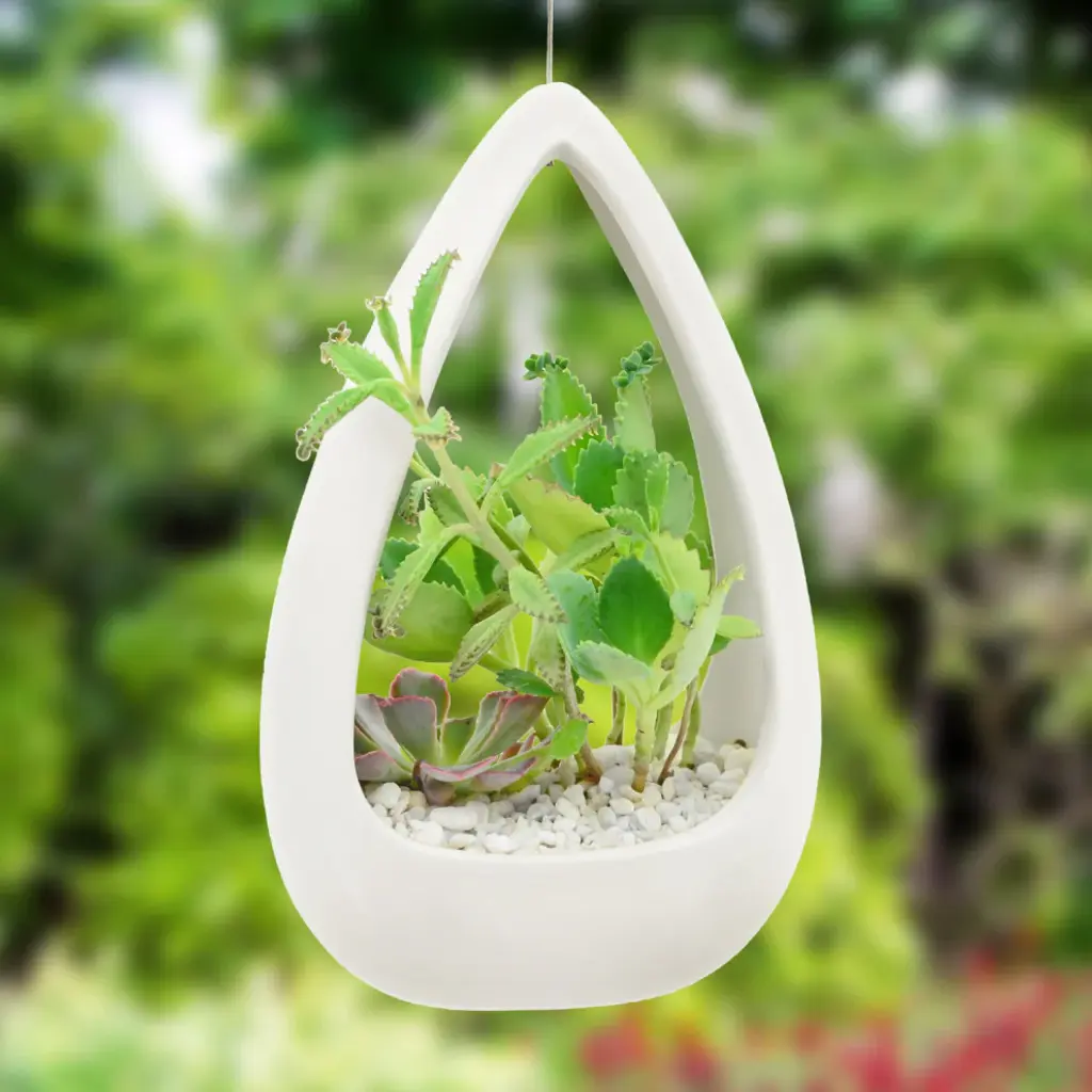 Arcadia Garden Products Cone Air Planters are a unique and aesthetic way to grow your delicate air plants, succulents or cactus. They make great small item organizers such as candy, school and office supplies. These come ready to hang making an easy addition inside or outside. A perfect accessory to the patio, the garden, or for fresh herbs in the kitchen.INDOOR/OUTDOOR: Designed using a high-quality ceramic, perfect for indoor or outdoor useHARDWARE INCLUDED: Include durable wire hangerCREATE: Create a hanging garden with cactus, succulents or small herbsORGANIZE: Great for organizing office supplies, toiletries and other smaller itemsSize: 8.5"x5.25" | Material: Ceramic | Weather Resistant | Plants Not Included
