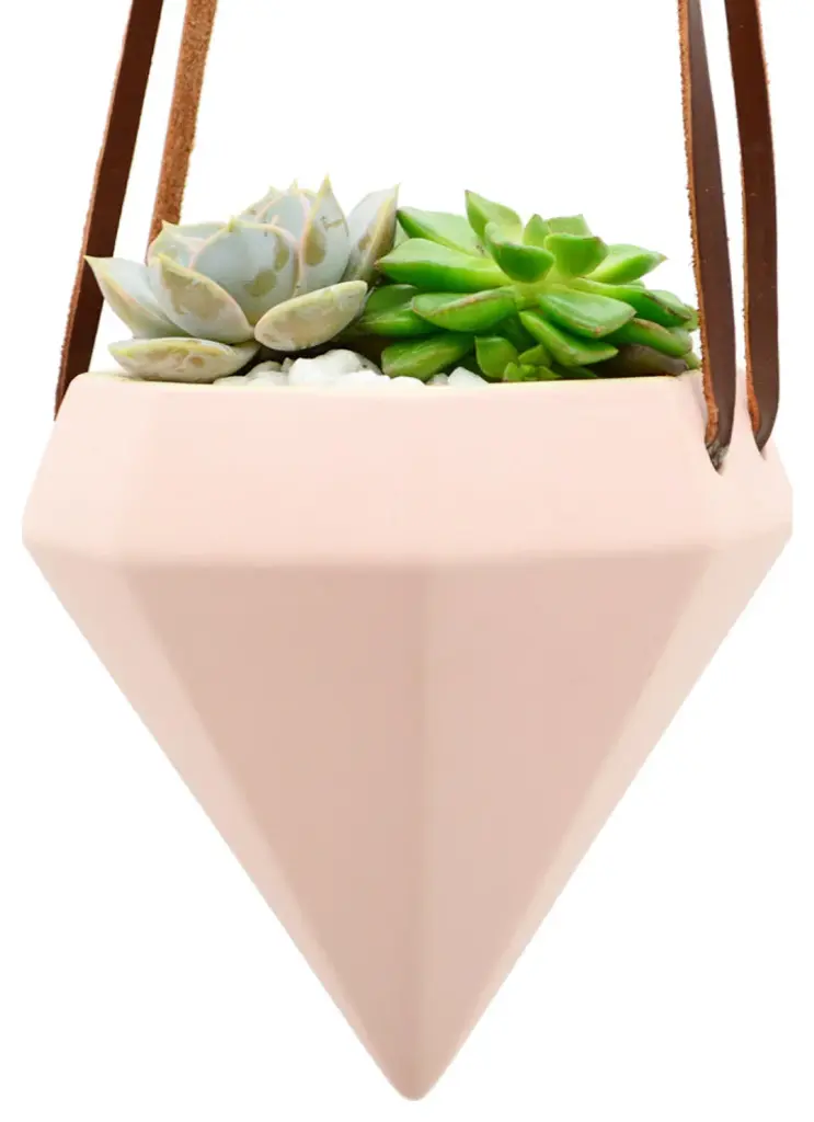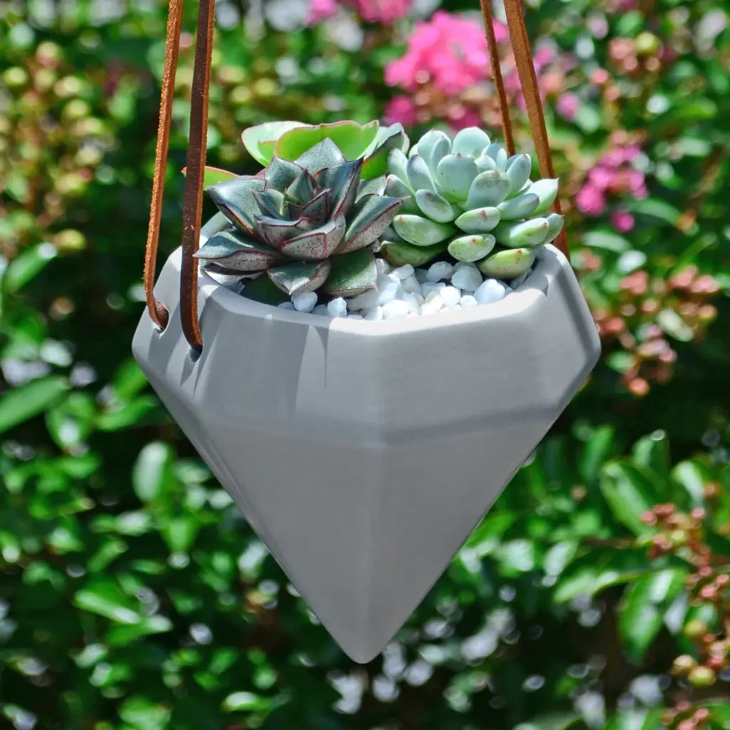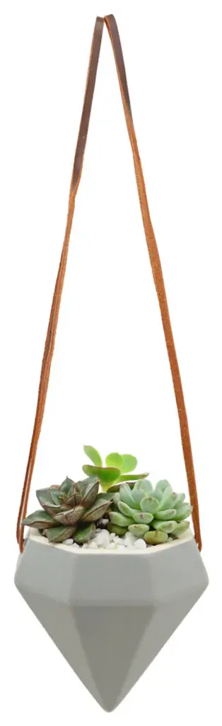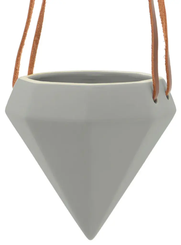 Arcadia Garden Products Diamond Air Planters are a unique and aesthetic way to grow your delicate air plants, succulents or cactus. They make great small item organizers such as candy, school and office supplies. These come ready to hang making an easy addition inside or outside. A perfect accessory to the patio, the garden, or for fresh herbs in the kitchen.INDOOR/OUTDOOR: Designed using a high-quality ceramic, perfect for indoor or outdoor useHARDWARE INCLUDED: Include durable leather straps for hangingCREATE: Create a hanging garden with cactus, succulents or small herbsORGANIZE: Great for organizing office supplies, toiletries and other smaller itemsSize: 4.5"x4.5" | Material: Ceramic | Weather Resistant | Plants Not Included