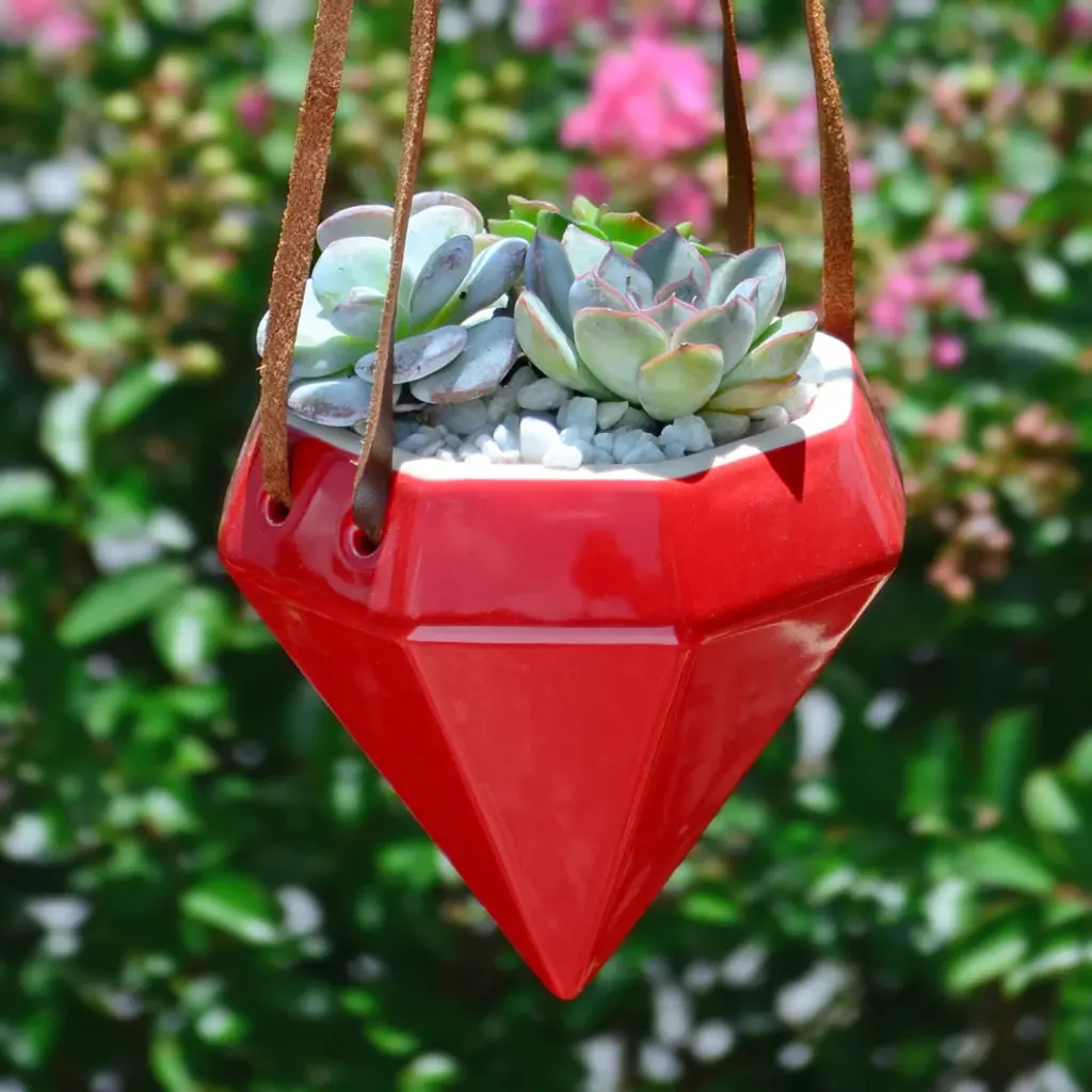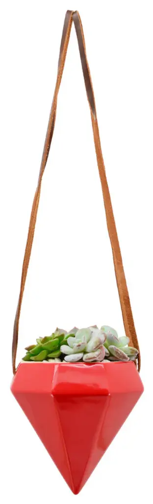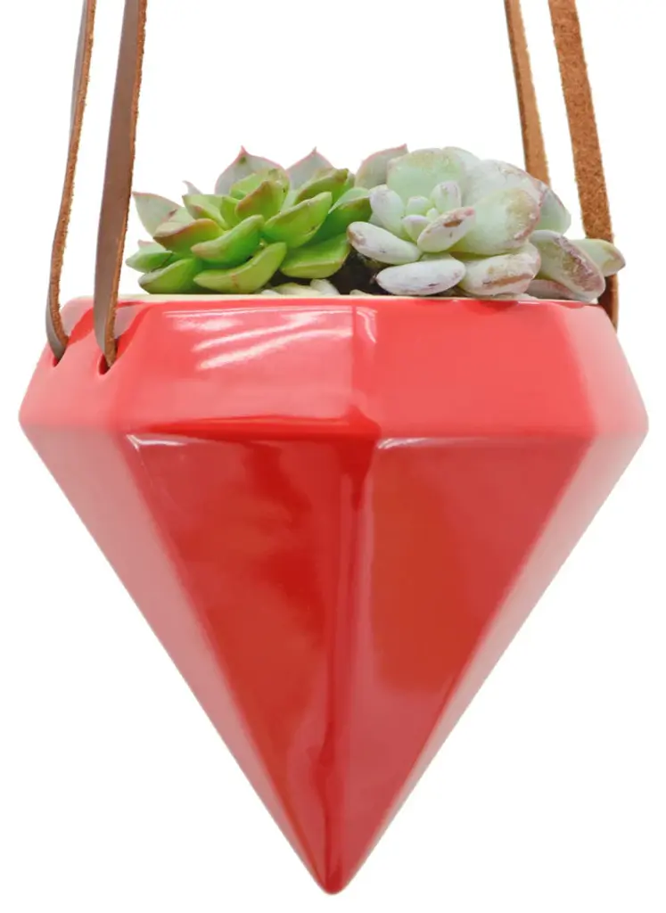 Arcadia Garden Products Diamond Air Planters are a unique and aesthetic way to grow your delicate air plants, succulents or cactus. They make great small item organizers such as candy, school and office supplies. These come ready to hang making an easy addition inside or outside. A perfect accessory to the patio, the garden, or for fresh herbs in the kitchen.INDOOR/OUTDOOR: Designed using a high-quality ceramic, perfect for indoor or outdoor useHARDWARE INCLUDED: Include durable leather straps for hangingCREATE: Create a hanging garden with cactus, succulents or small herbsORGANIZE: Great for organizing office supplies, toiletries and other smaller itemsSize: 4.5"x4.5" | Material: Ceramic | Weather Resistant | Plants Not Included