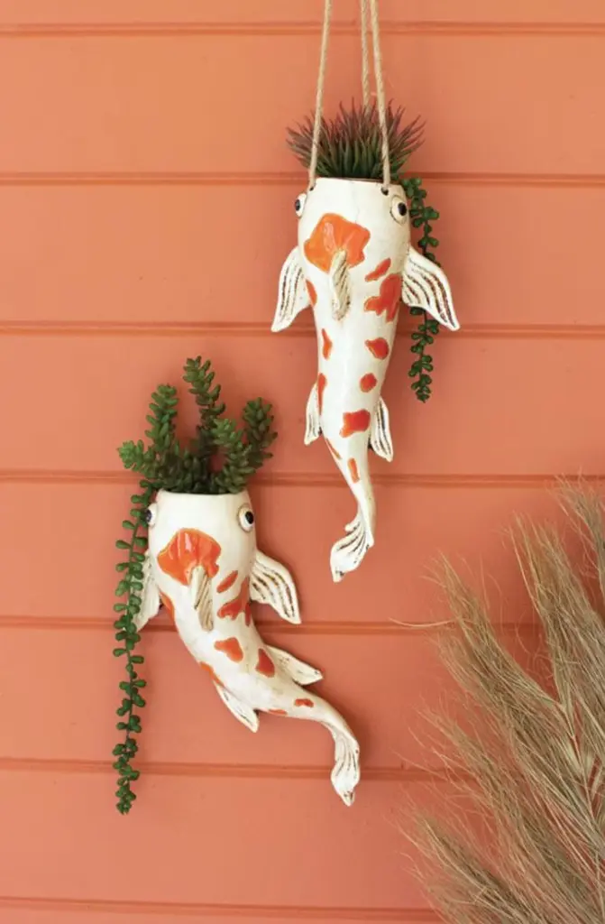 Ceramic Koi Fish Hanging Planter. Spice up your succulent display with this hanging koi fish planter. At 13" tall, he's the perfect hanging addition to an aquarium or succulent space. The planter is his mouth and he hangs free of the wall. Start a koi display with his brother the wall planter or hang this guy on his own. Rope length is adjustable. No drainage hole. Wipe clean with a lint free, dry cloth. Matching pieces sold separately. Fully assembled. Manufacturer: Kalalou.