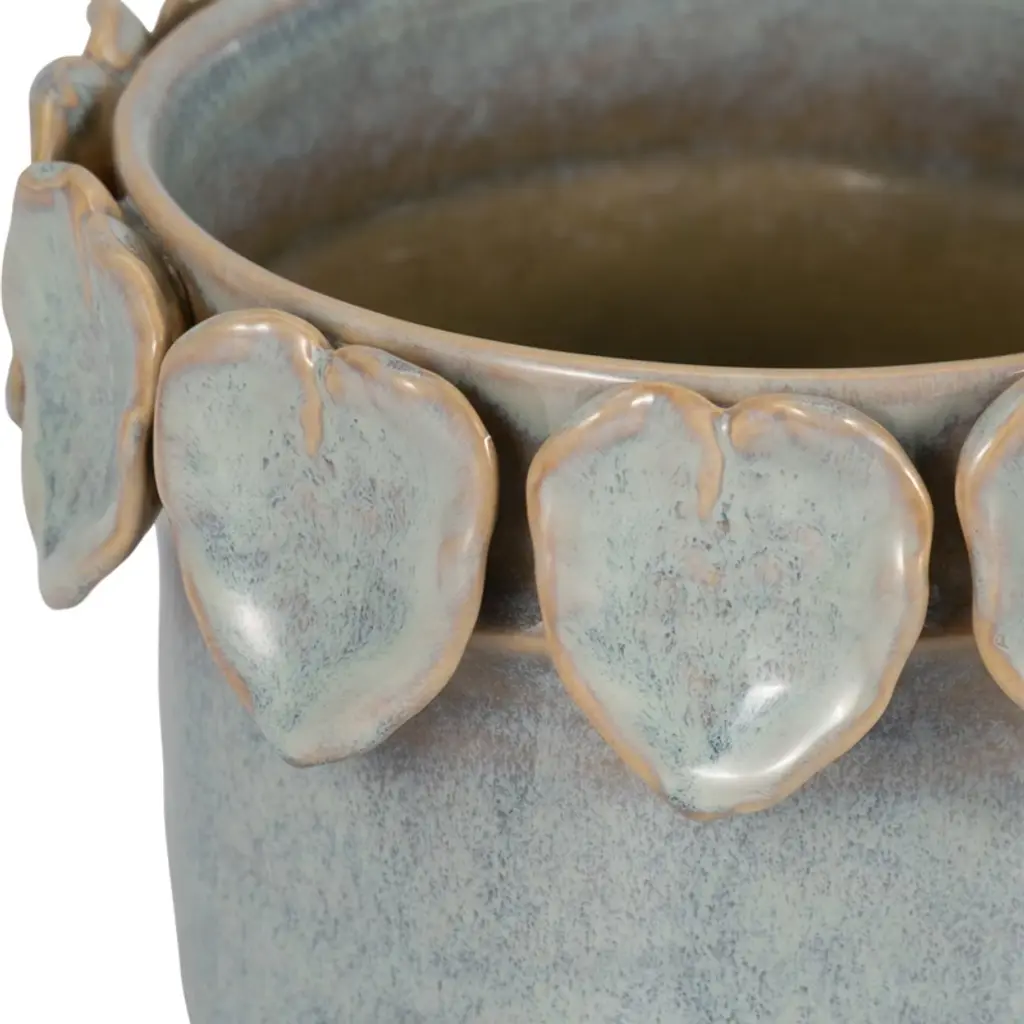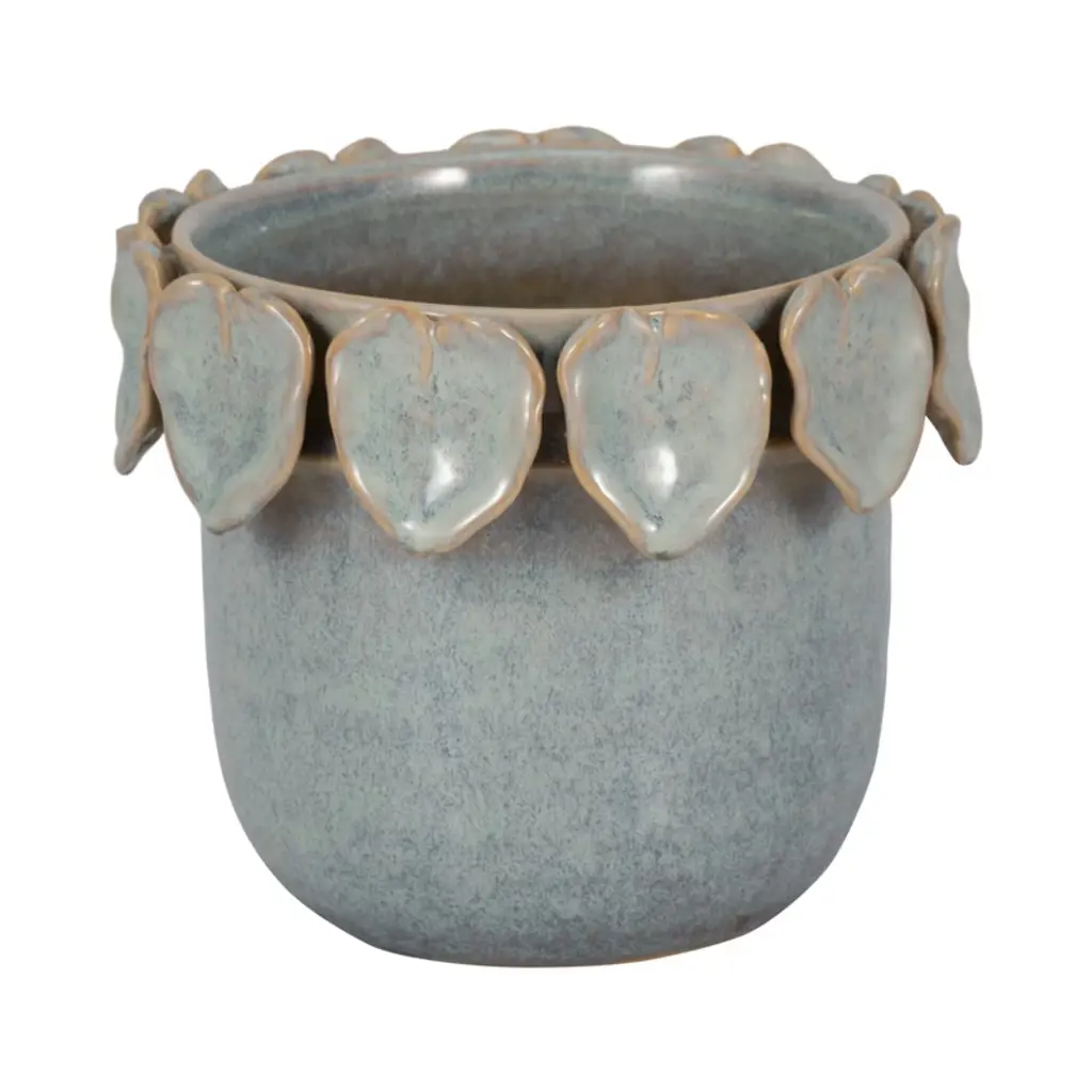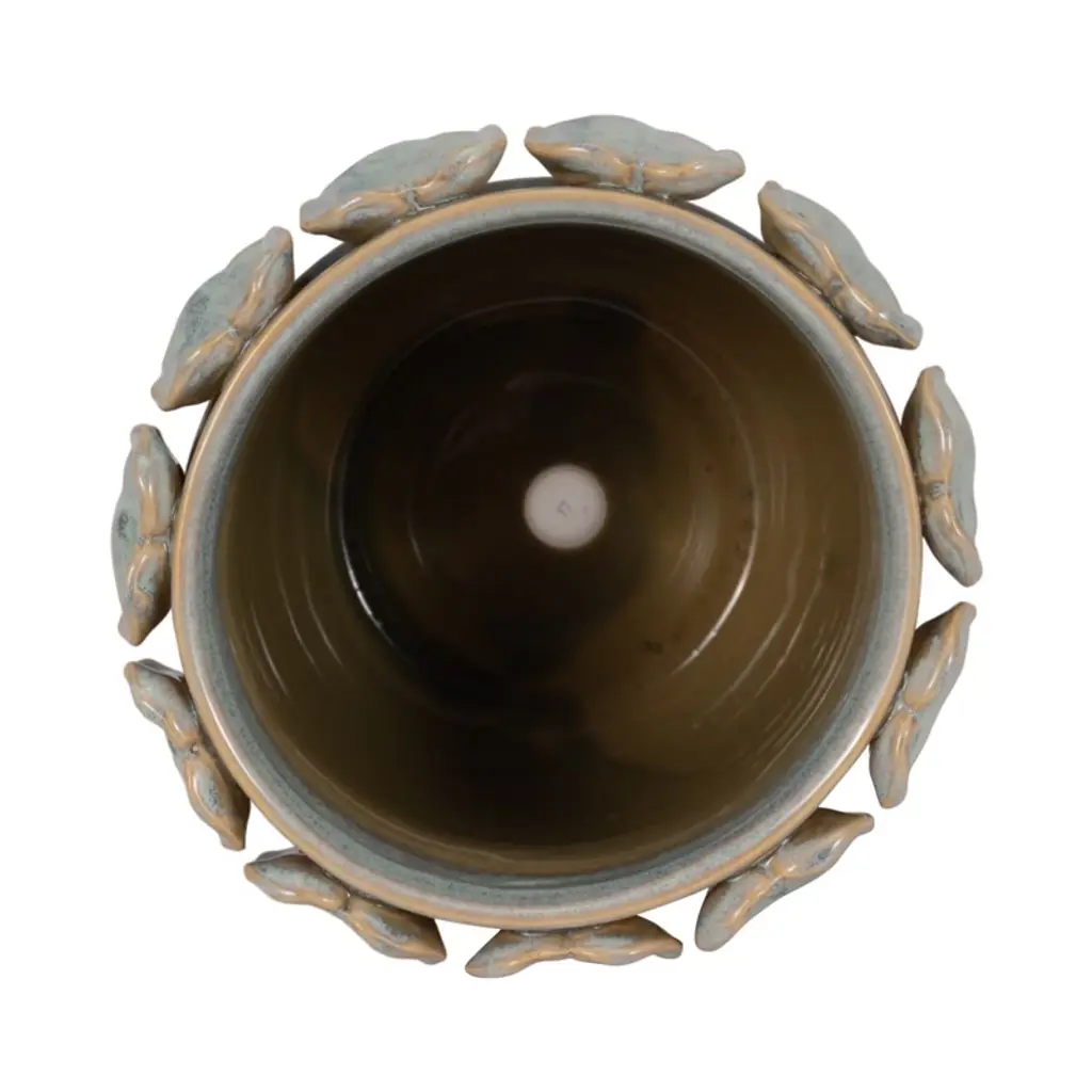 Ceramic Planter With Handcrafted Leaf Rim Design, Indoor Or Outdoor Garden Decor, Decorative Plant Container For Home Office Patio Display