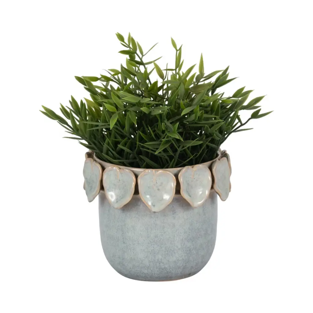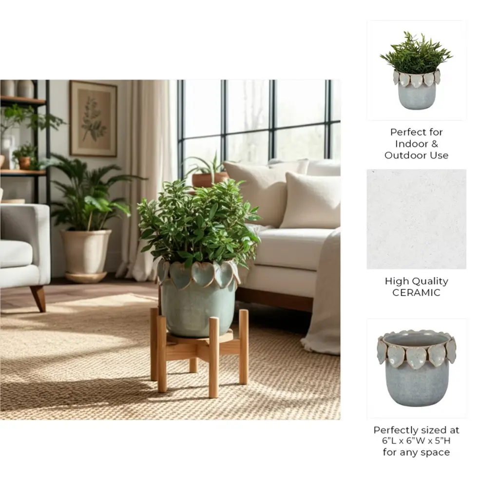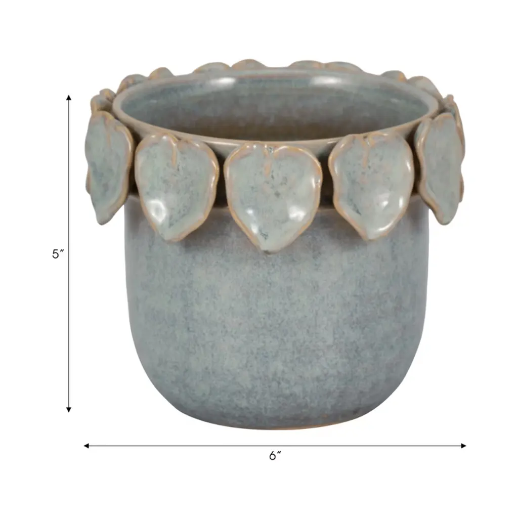 Add charm and artisan character to your home or garden with this handcrafted ceramic stoneware planter, measuring 6x6x5 inches. Designed for both indoor and outdoor use, this versatile planter is ideal for displaying real or faux plants on your kitchen windowsill, patio, entryway, or office desk. The sculpted ceramic leaves around the rim bring a nature-inspired touch, creating a statement piece in any plant display, while the smooth gradient blue glaze offers a calming, timeless look that complements everything from farmhouse and rustic to modern and boho decor styles. Made from high-quality ceramic stoneware, this planter offers durability, longevity, and weather-resistance, making it a lasting addition to your home or garden decor. The built-in drainage hole at the bottom supports healthy root development and makes this vessel a practical choice for seasoned plant lovers and beginners alike. Whether you are growing succulents, herbs, or showcasing seasonal blooms, this artisan planter blends aesthetic beauty with essential functionality. Elevate your plant styling with a pot that's not only beautiful but built to last. Add this unique decorative planter to your cart today to bring handcrafted warmth and elegant botanical charm to your space.