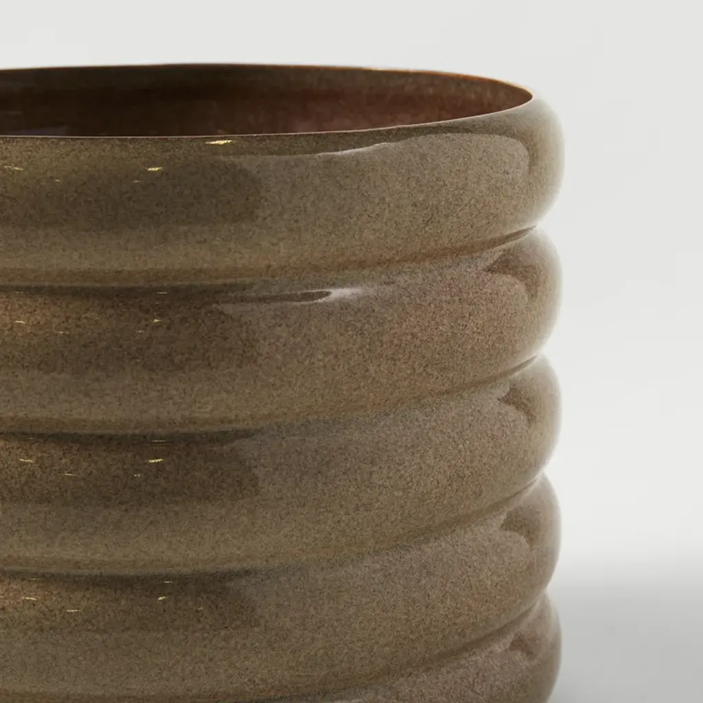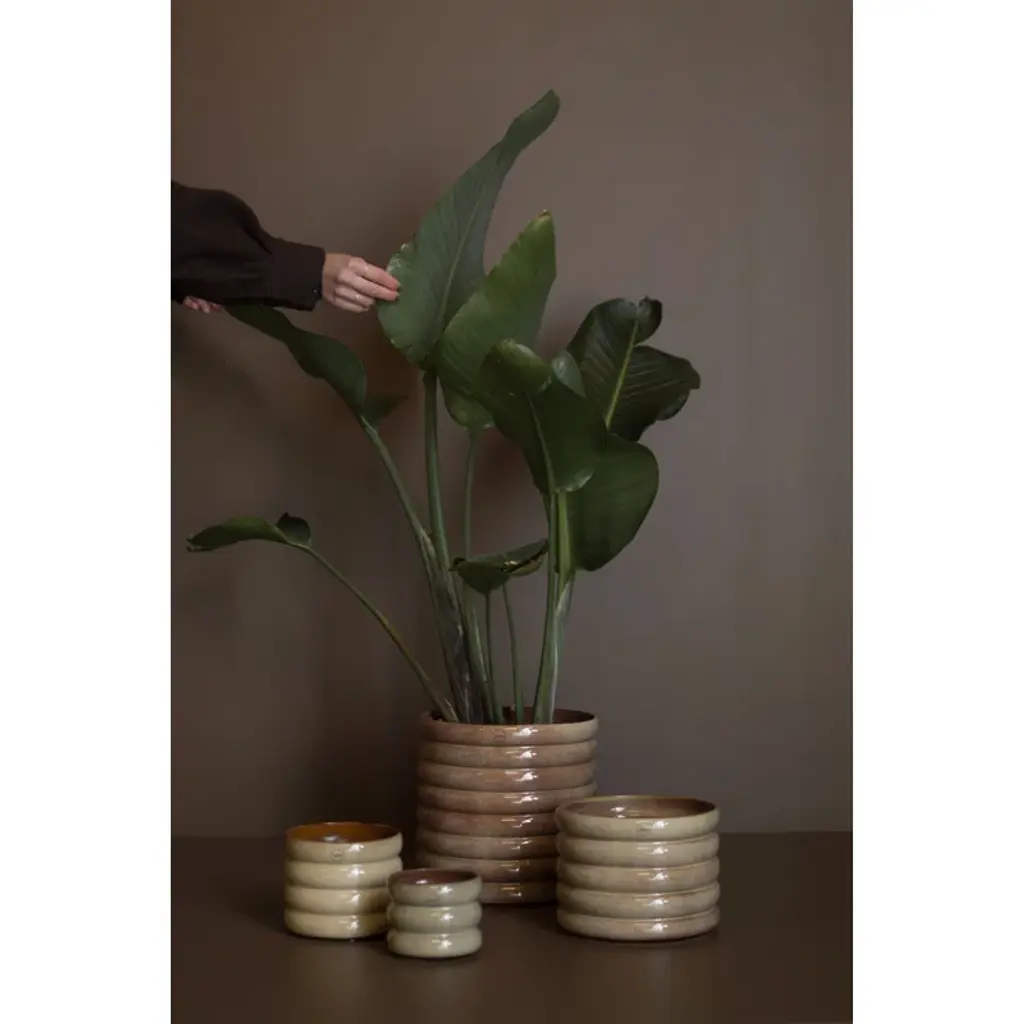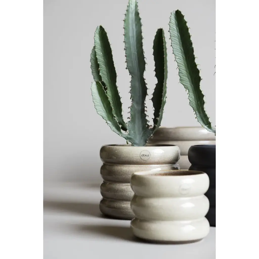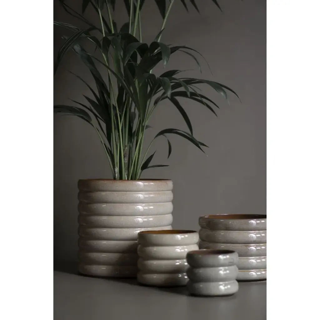 Rounded + refined. This ceramic planter brings sculptural texture to your indoor space with its stacked ring silhouette and glossy glaze. Its smooth curves and neutral finish offer an artful foundation for your favorite greenery – whether styled solo or in a group.