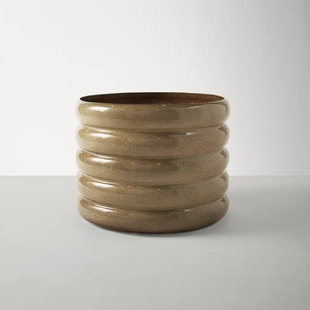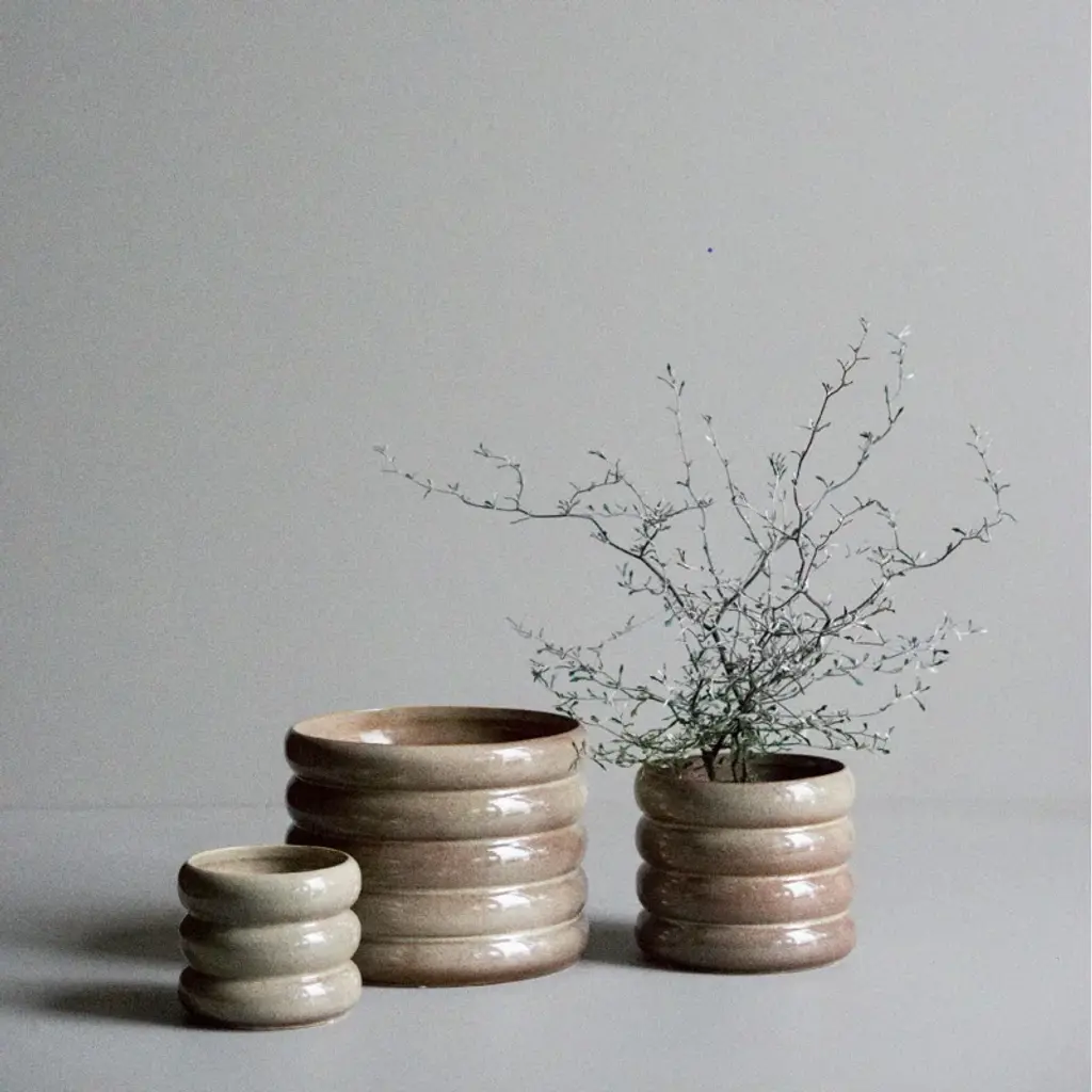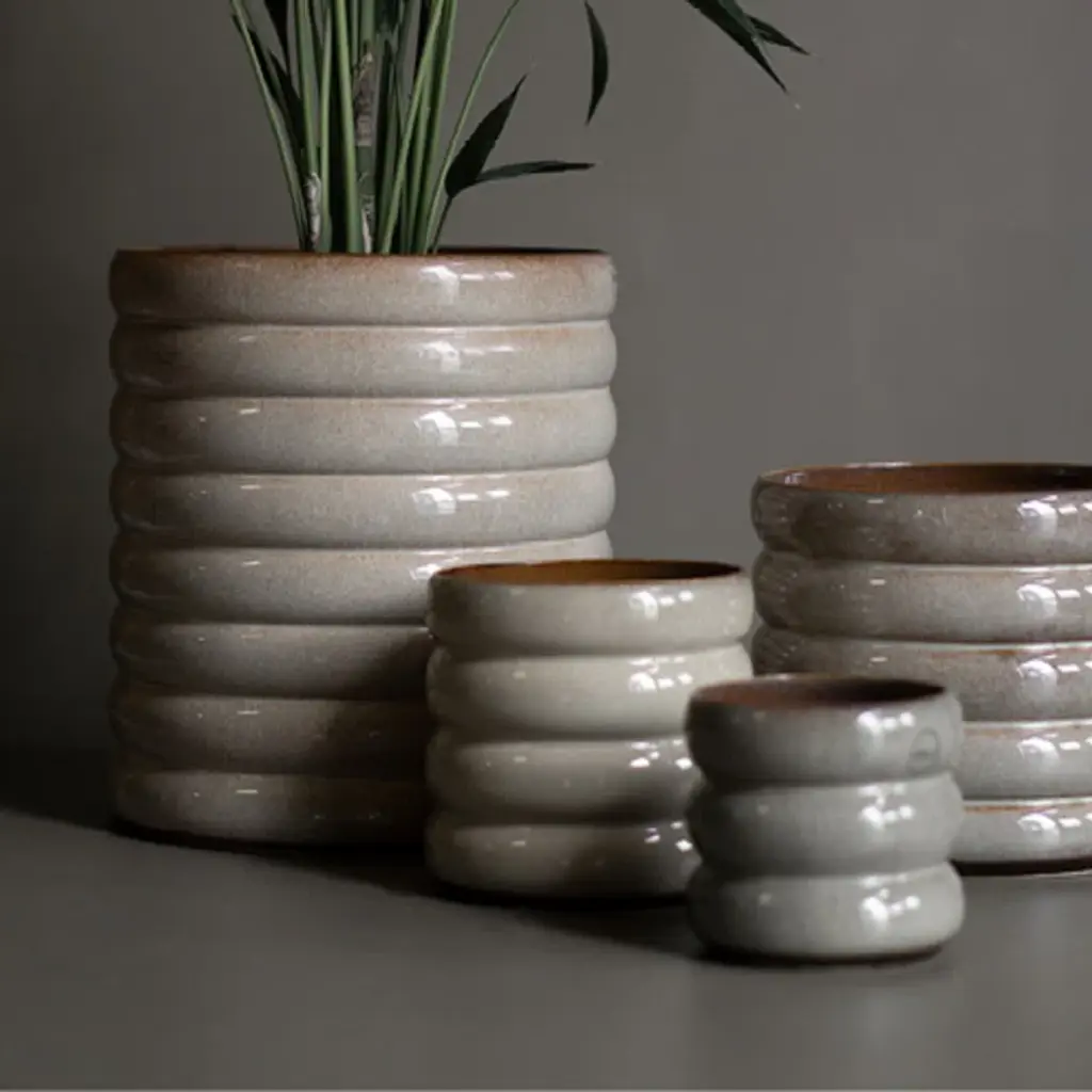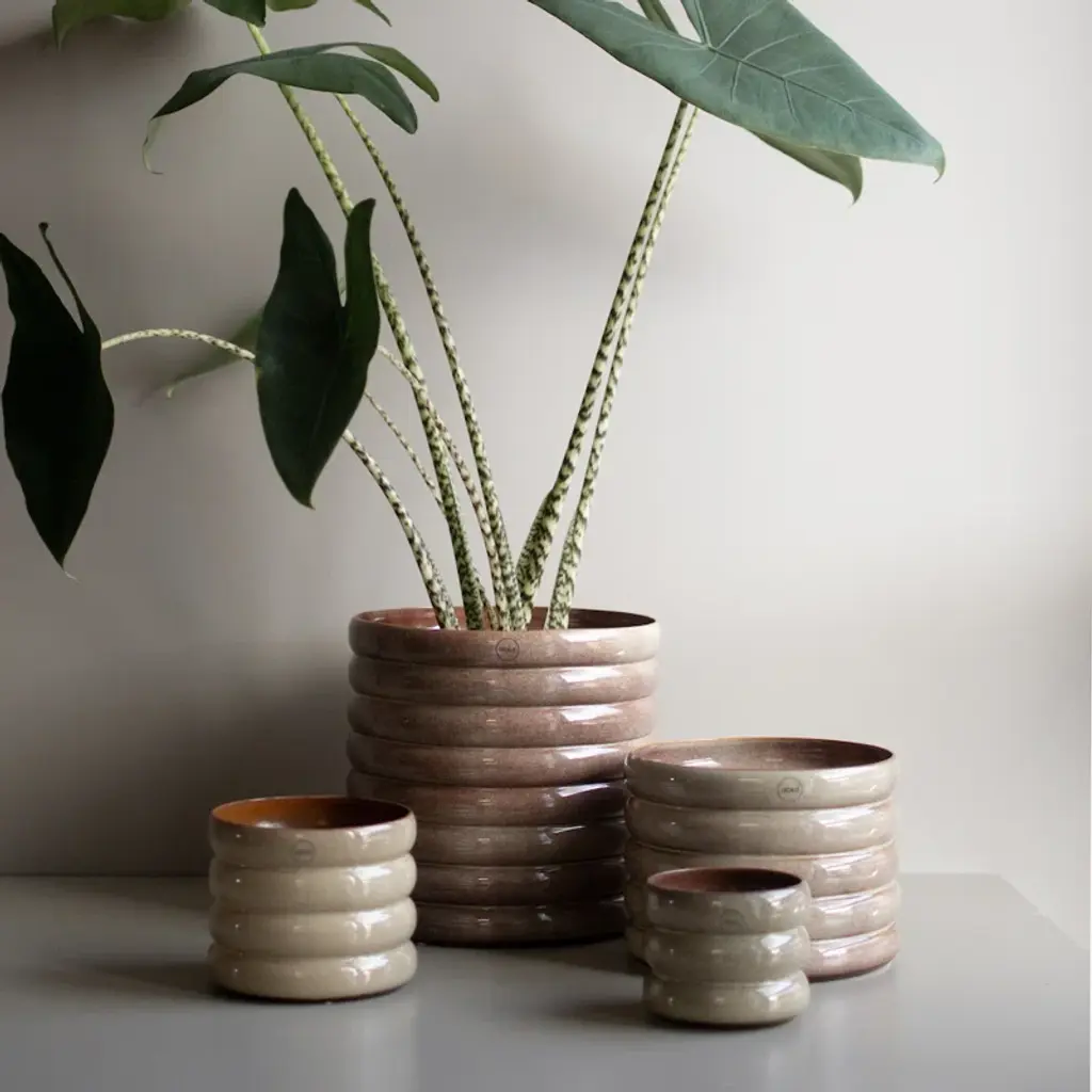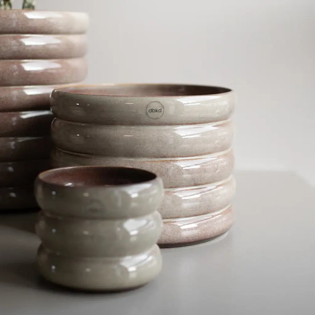 Rounded + refined. This ceramic planter brings sculptural texture to your indoor space with its stacked ring silhouette and glossy glaze. Its smooth curves and neutral finish offer an artful foundation for your favorite greenery – whether styled solo or in a group.