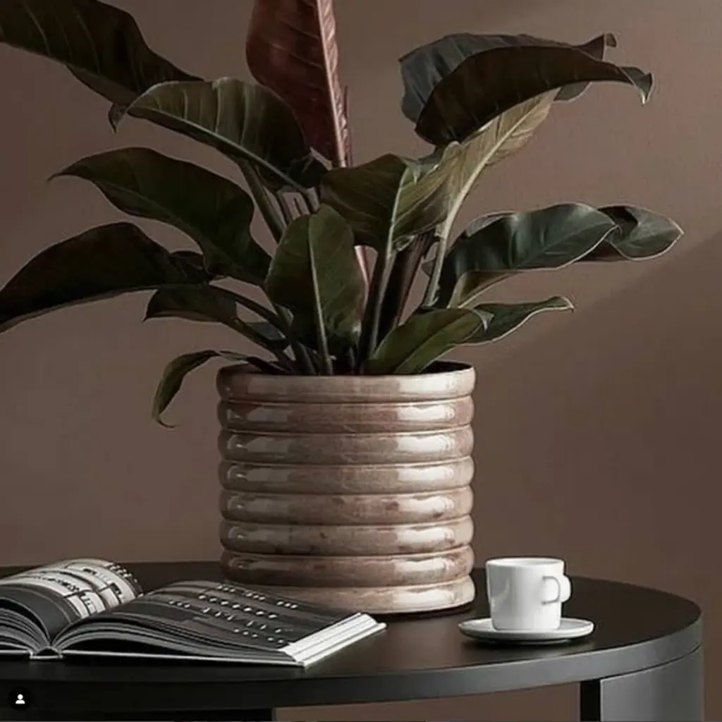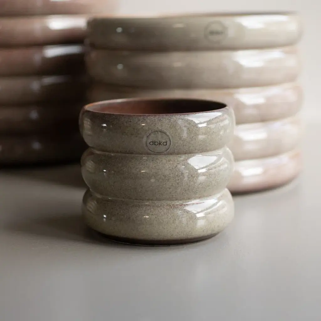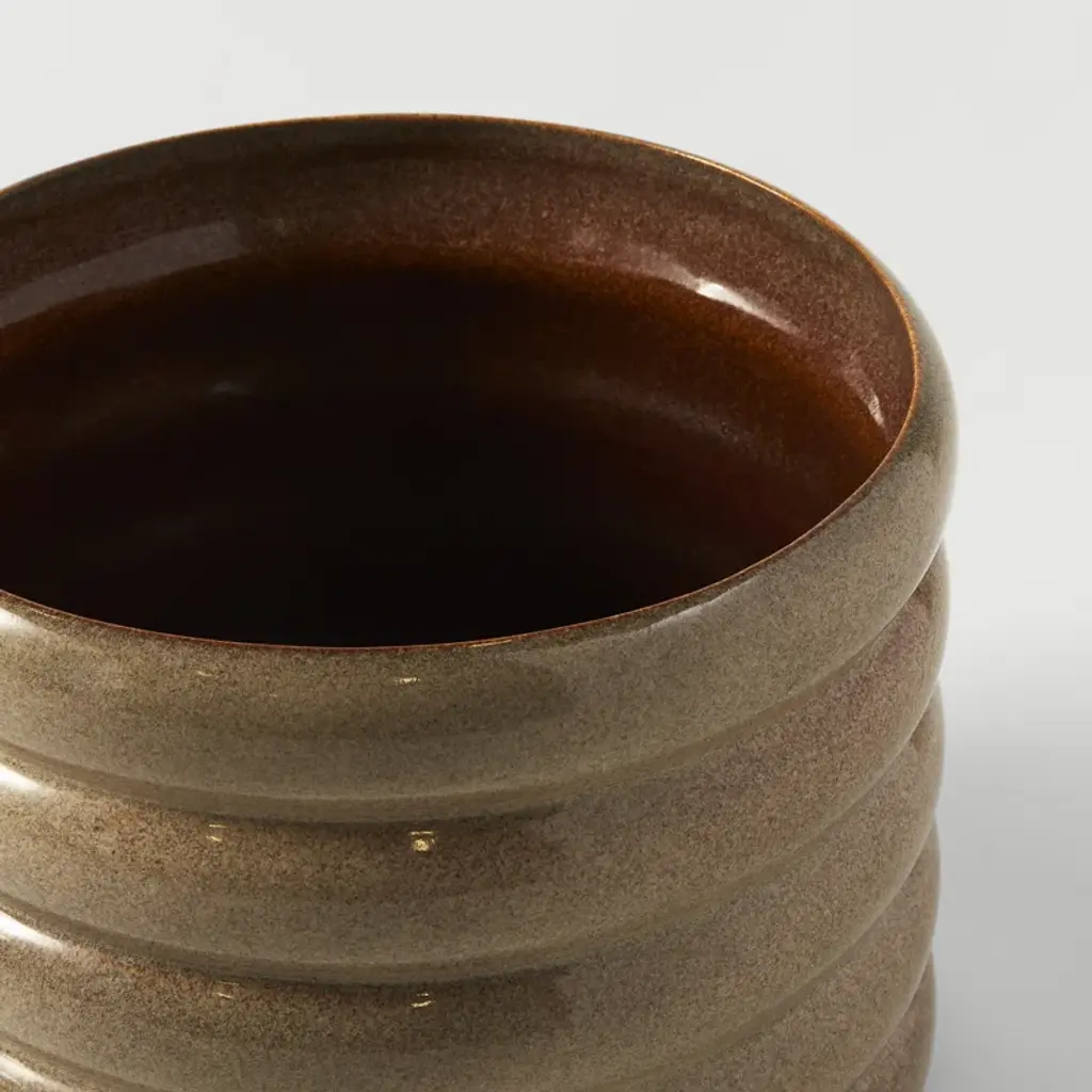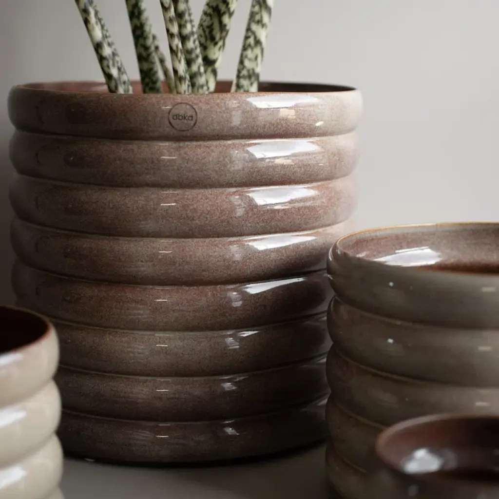 Rounded + refined. This ceramic planter brings sculptural texture to your indoor space with its stacked ring silhouette and glossy glaze. Its smooth curves and neutral finish offer an artful foundation for your favorite greenery – whether styled solo or in a group.