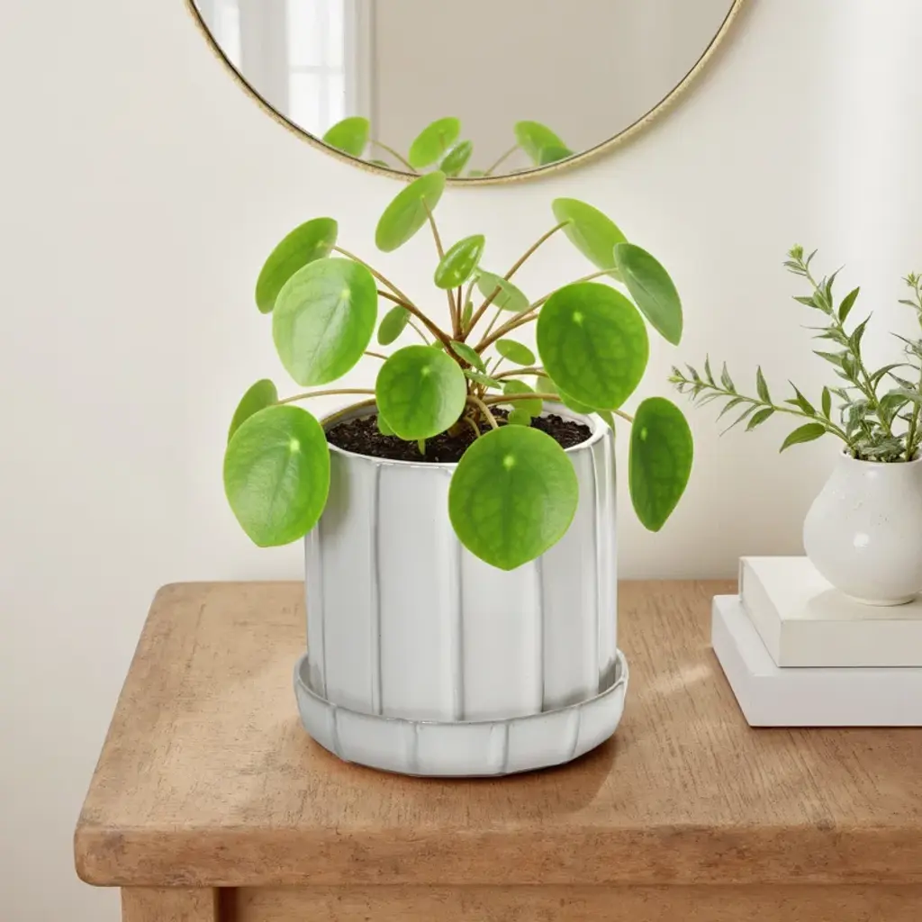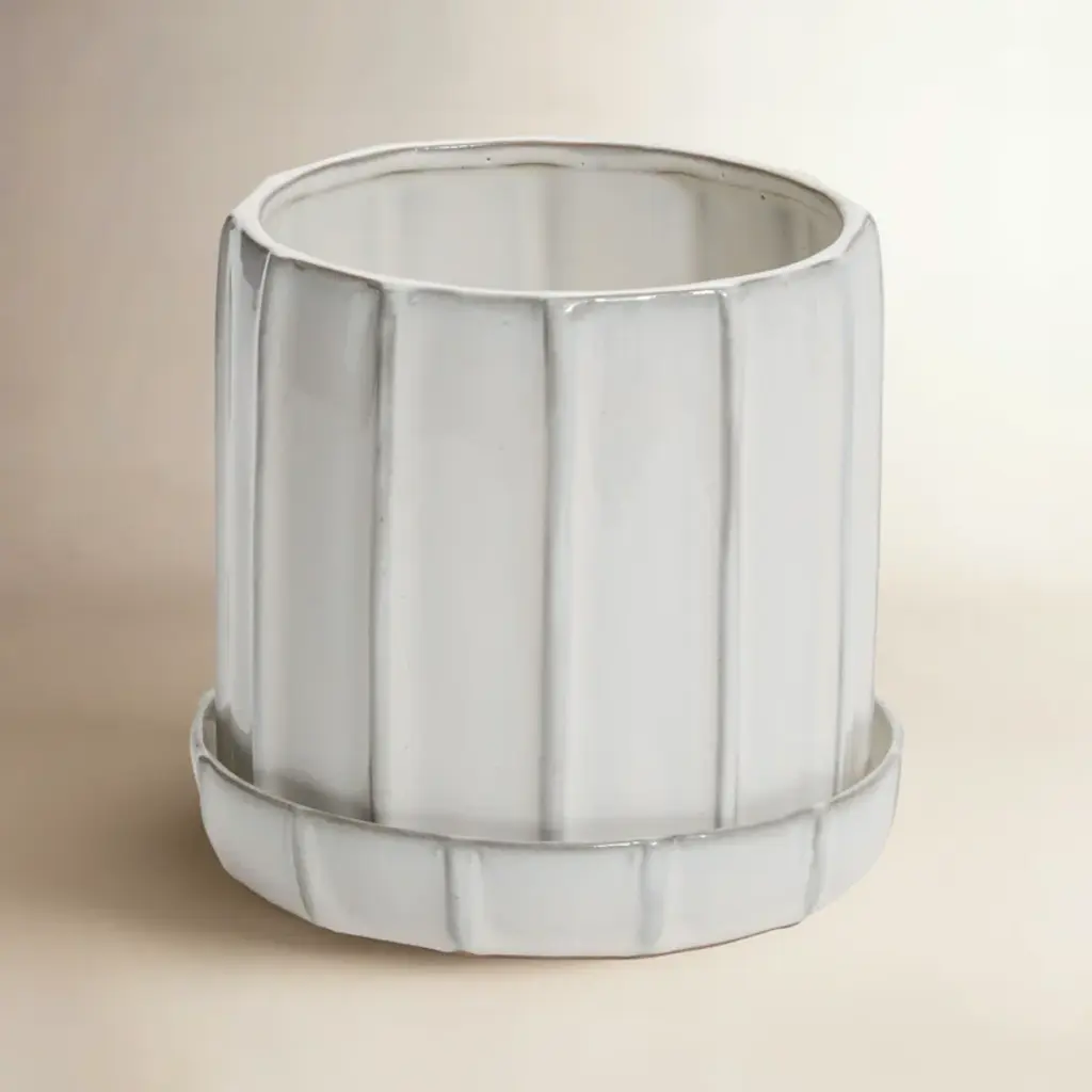 The pot in creamy white glaze has a vertical ridged design, along with a drainage hole and saucer, proving the importance of attention to detail when you're looking for the perfect pot.
