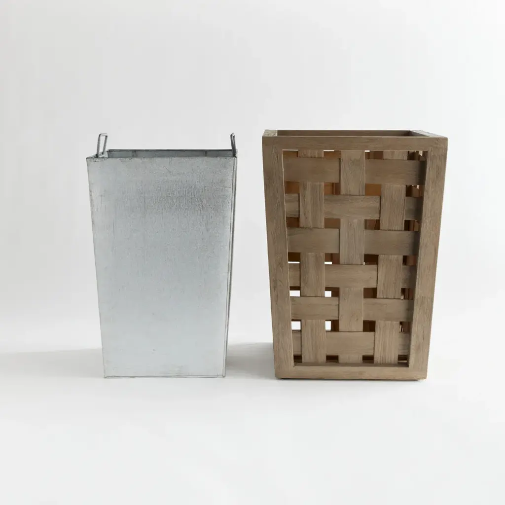 Expertly handwoven using wide gray washed teak wood panels in a check pattern. An exclusive design you won''t see anywhere else, this showstopping planter has a galvanized steel liner with folding handles, drainage hole and is designed with a raised bottom. Smart as well as beautiful!. Made of gray washed teak panels. Made by a highly skilled artisan. Removable steel liner