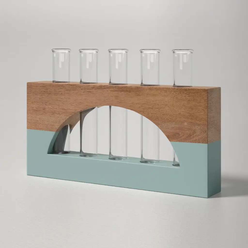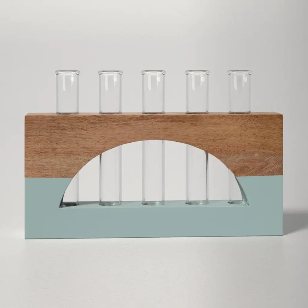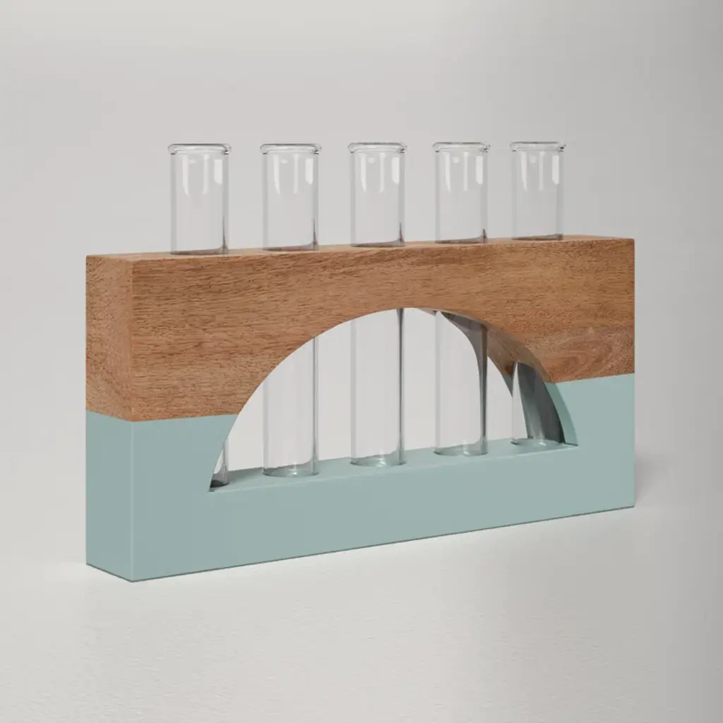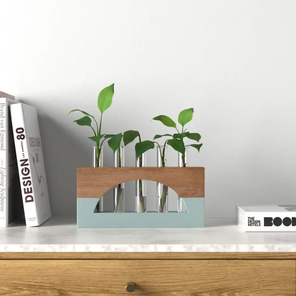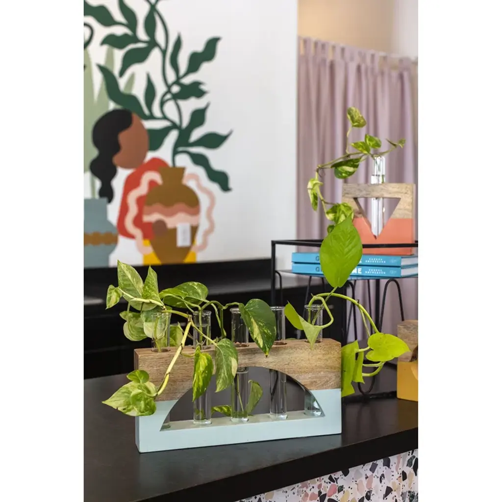 The lotem propagation stand features modern wood with a geometric cutout and color-blocked design, plus a test tube for propagating all your plants and showing them off in style.
